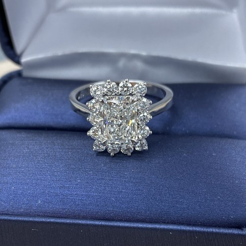 Dieser atemberaubende Verlobungsring verfügt über einen 2,04-Karat-IGI-zertifizierten, strahlend modifizierten Brilliant Cut Diamond, der elegant von runden brillanten Diamanten in einem schillernden Sunburst-Design umgeben ist. Dieses exquisite Stück handgefertigt in 14.000 Weißgold fangt Brillanz und Eleganz ein und macht es zu einer perfekten Wahl für einen zeitlosen Vorschlag.