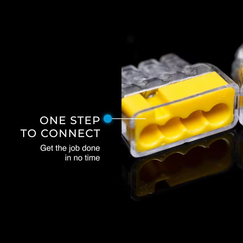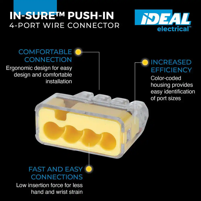 Save time on the job and experience your fastest wire connections with our single-step In-Sure Push-In Wire Connectors. This no-twist wire connector's low insertion force and ergonomic design reduces fatigue in your hands and wrists, helping you power through your jobs without the strain. Get visual confirmation that your connections are secure with the clear polycarbonate shell, while the color-coded design improves your productivity with easy port identification. This versatile wire connector is listed for use with 12-20 AWG solid wires, 12-16 AWG stranded wires, and 12 AWG copper-clad aluminum wires. Its compact size seamlessly fits into any box making these a top choice for lighting installations, prefabricated wiring systems, and other branch circuit wiring applications. Work with a new level of confidence knowing that these durable push-in connectors have CSA certification and are UL-listed to safely support up to 600V. In-Sure Push-In Wire Connectors-Giving you the push you need to get the job done faster.