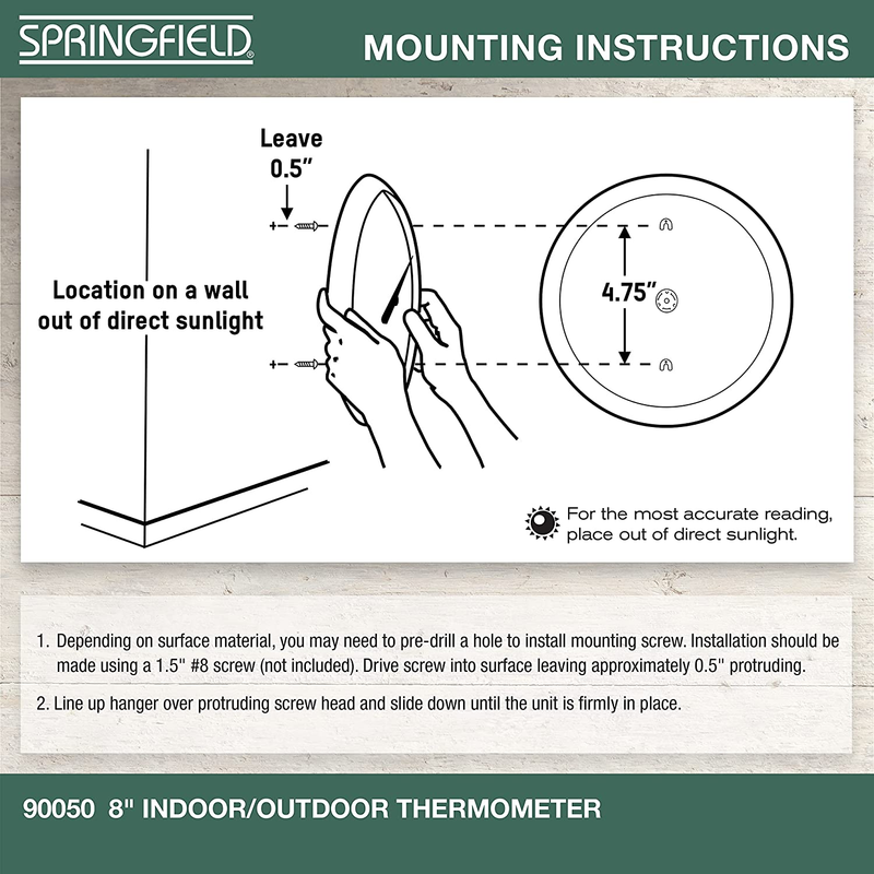 Check temperatures at a glance with the Springfield Indoor Outdoor Big and Bold Dial Thermometer. Featuring an 8-inch dial with large, easy-to-read numbers, this classic thermometer is ideal for patios, gardening, greenhouses, or kitchens. Its wireless design allows versatile placement?hang it inside or outside?while the weather-resistant construction withstands seasonal changes. The precise mercury-free gauge measures from ?40F to 120F, delivering accurate readings in all conditions. A built-in mounting hook lets you display it conveniently, and its white frame blends seamlessly with any decor. Whether you're monitoring outdoor conditions or tracking temperature-sensitive environments, the Springfield thermometer combines nostalgic style with reliable performance to keep you informed year-round.