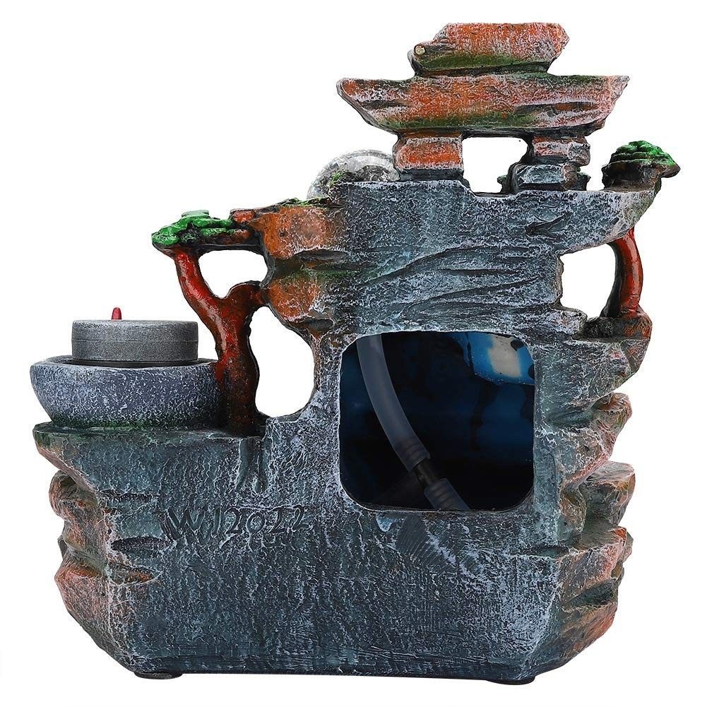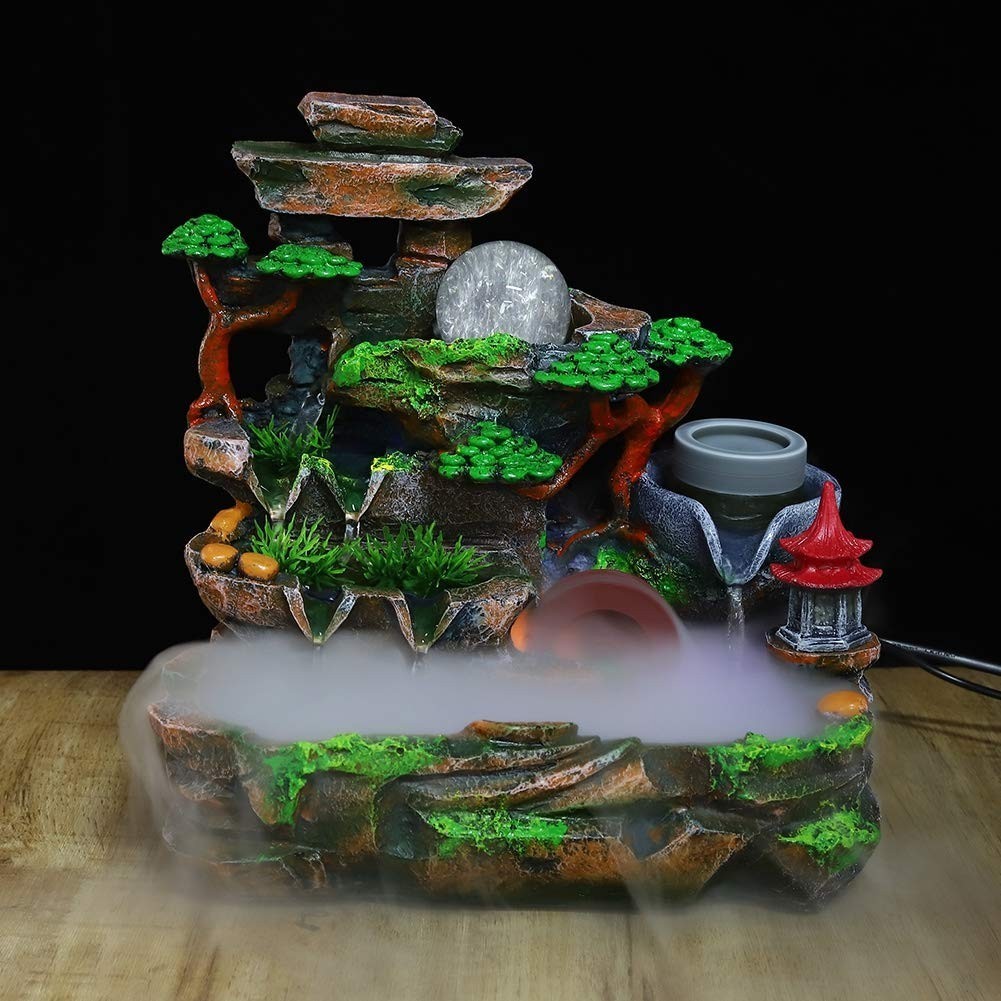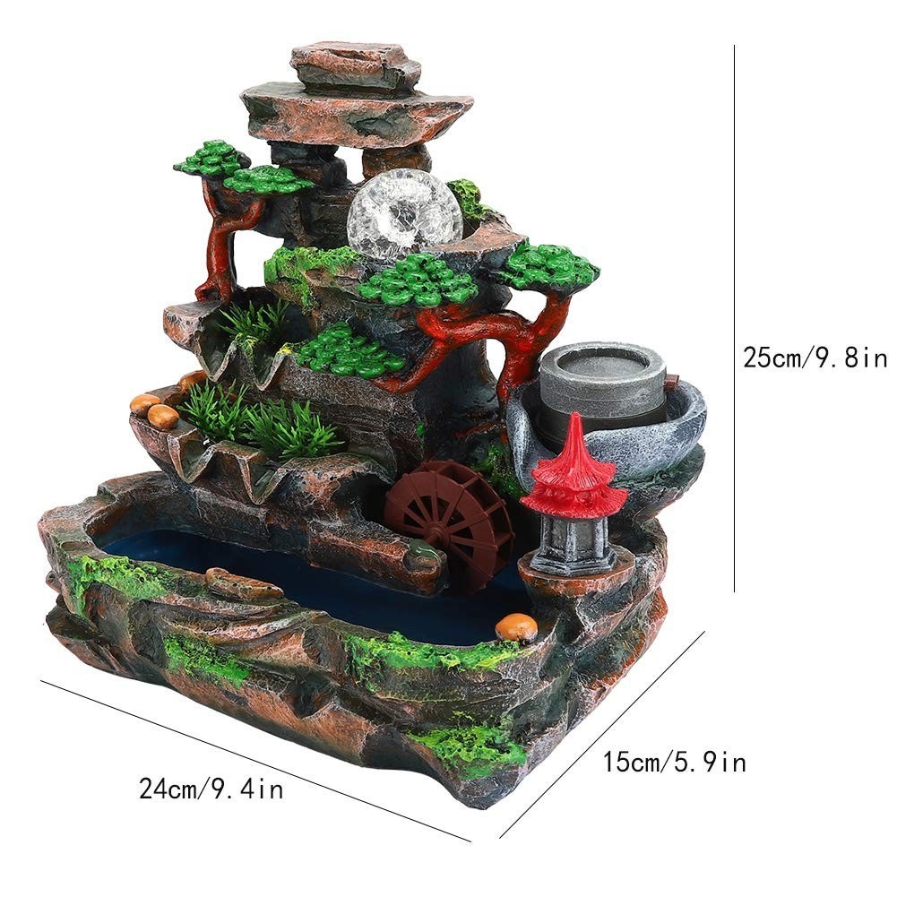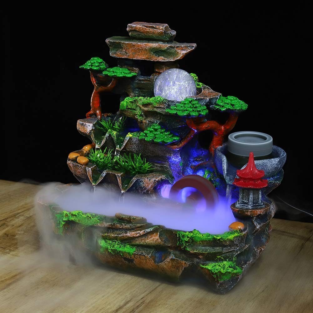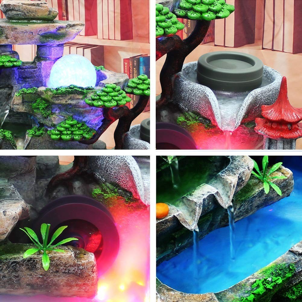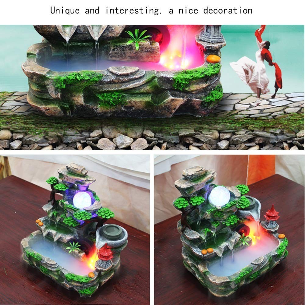 ?SPARKLING LED LIGHTS? Enjoy our water feature LED fountain lights in the evening on your garden patio or bedroom table. The colorful light and artificial landscape make the tabletop fountain the perfect choice for decoration. This desktop fountain is made of high quality synthetic resin material, non-toxic, safe and durable.