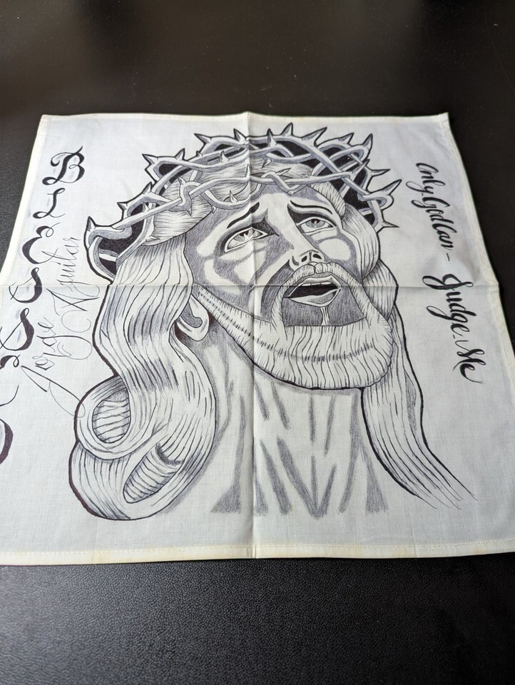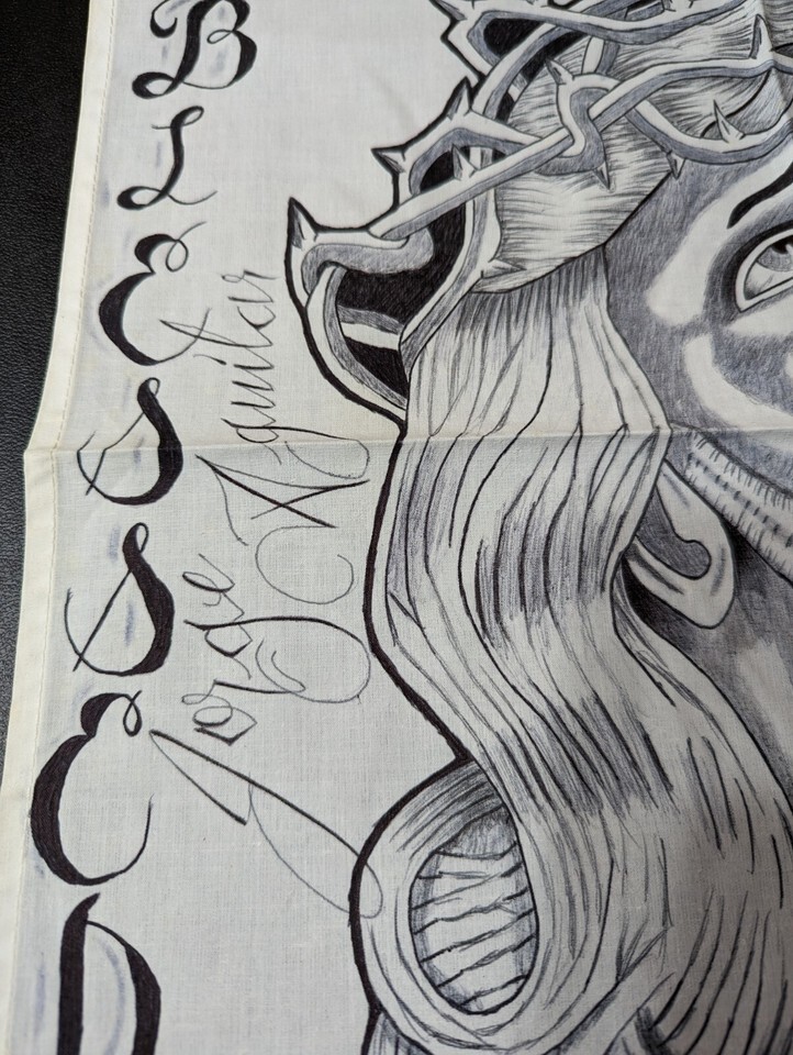 This unique piece of art is a hand drawn ink creation by the talented artist Jorge Aguilar. The subject matter in this small 15" x 15" piece is religion, and it is signed by the artist himself. The art style is inspired by prison art and is original, not a licensed reproduction. The material used is ink on linen and it was created in Texas, USA. This piece would be a great addition to any art collection due to its unique subject matter and distinctive style.