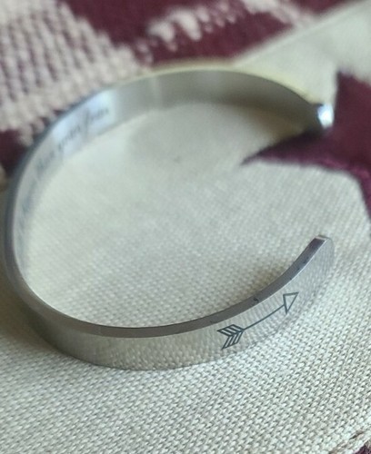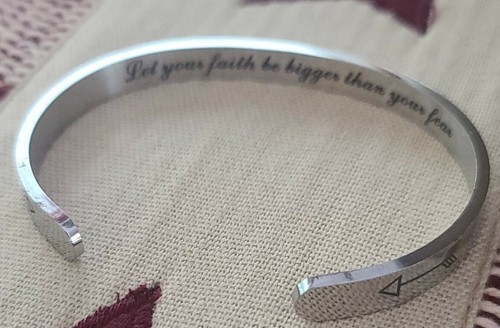 "Let Your Faith Be Bigger Than Your Fear" printed on the inside of bracelet with two arrows at each side of outside opening