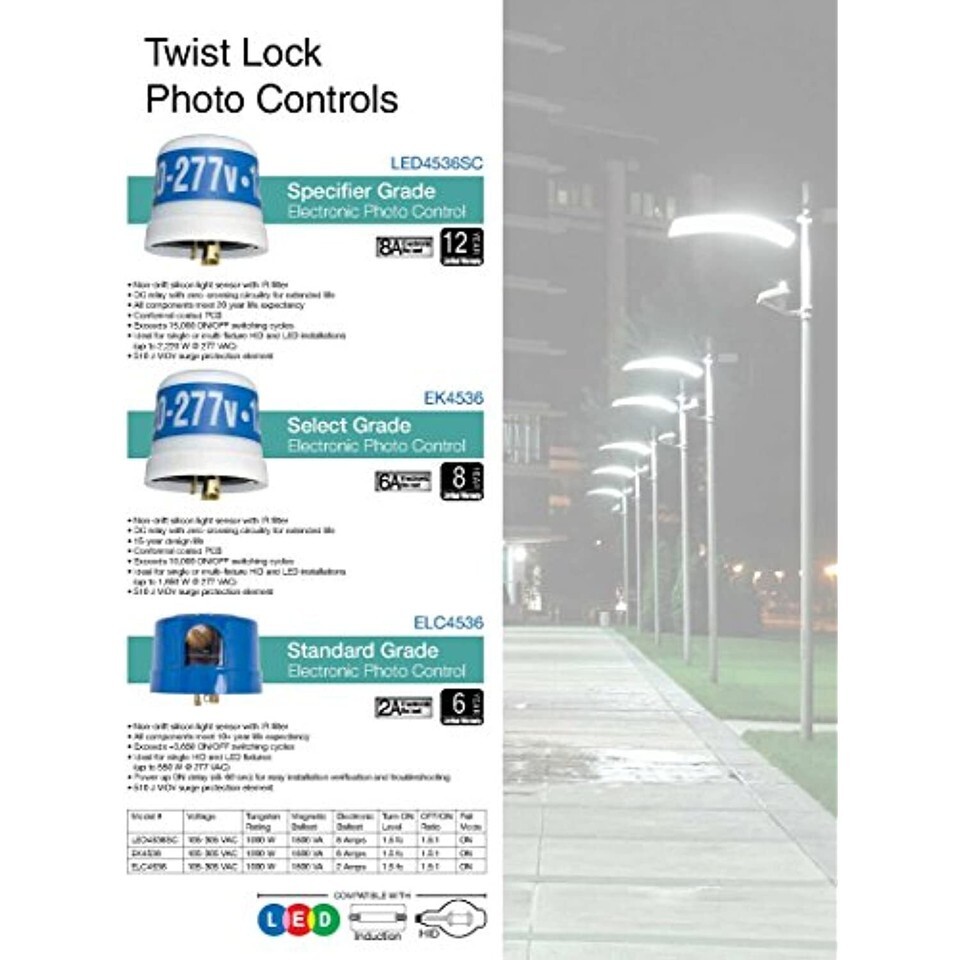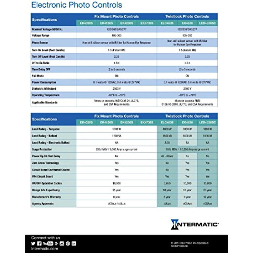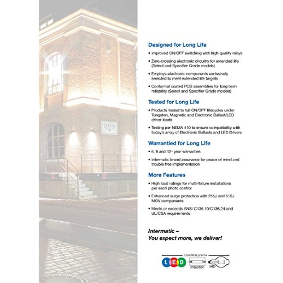 Are you installing light fixtures with extended life expectations? Intermatic's electronic photocontrols are designed to match the long life of new led lighting fixtures with a 10 to 20 year service life expectancy. This allows full realization of both the cost savings and benefits of maintenance-free lighting installations. The EK4136S fix mount electronic photocontrol by Intermatic has been designed, tested and warrantied for long life. It has improved on/off switching with high quality relays and employs electronic components exclusively selected to meet extended life targets. Products are tested to full on/off lifecycles under tungsten, magnetic and electronic ballast/left driver loads. Testing is done per NEMA 410 to ensure compatibility with today's array of electronic ballasts and LED drivers. The Intermatic brand assures you of peace of mind and trouble-free implementation. It has enhanced surge protection with 255J and 510J move components. It meets or exceeds ANSI C136.10/C136.24 and UL/CSA requirements. 105-305 VAC, 1000W tungsten, 1800 VA magnetic ballast, 6 AMP electronic ballast, 1.5 fc turn on level, off/on ratio 1.5:1, fail mode: on, 6 inch wire length.