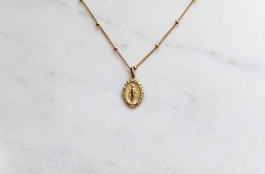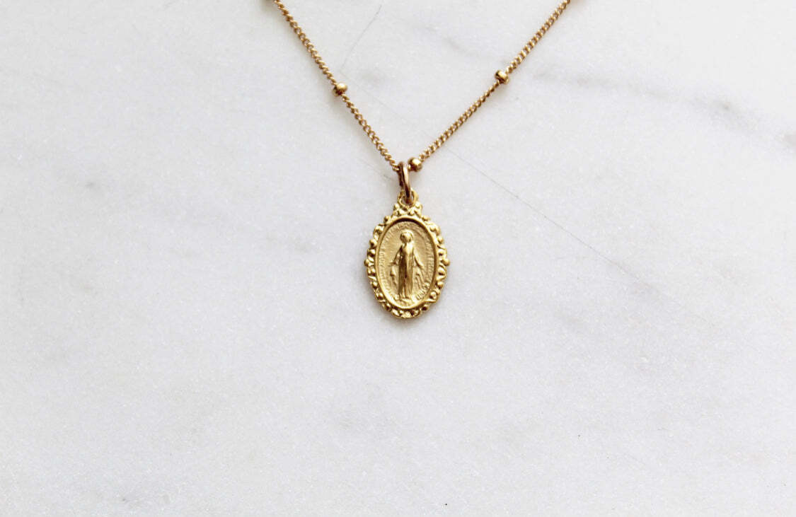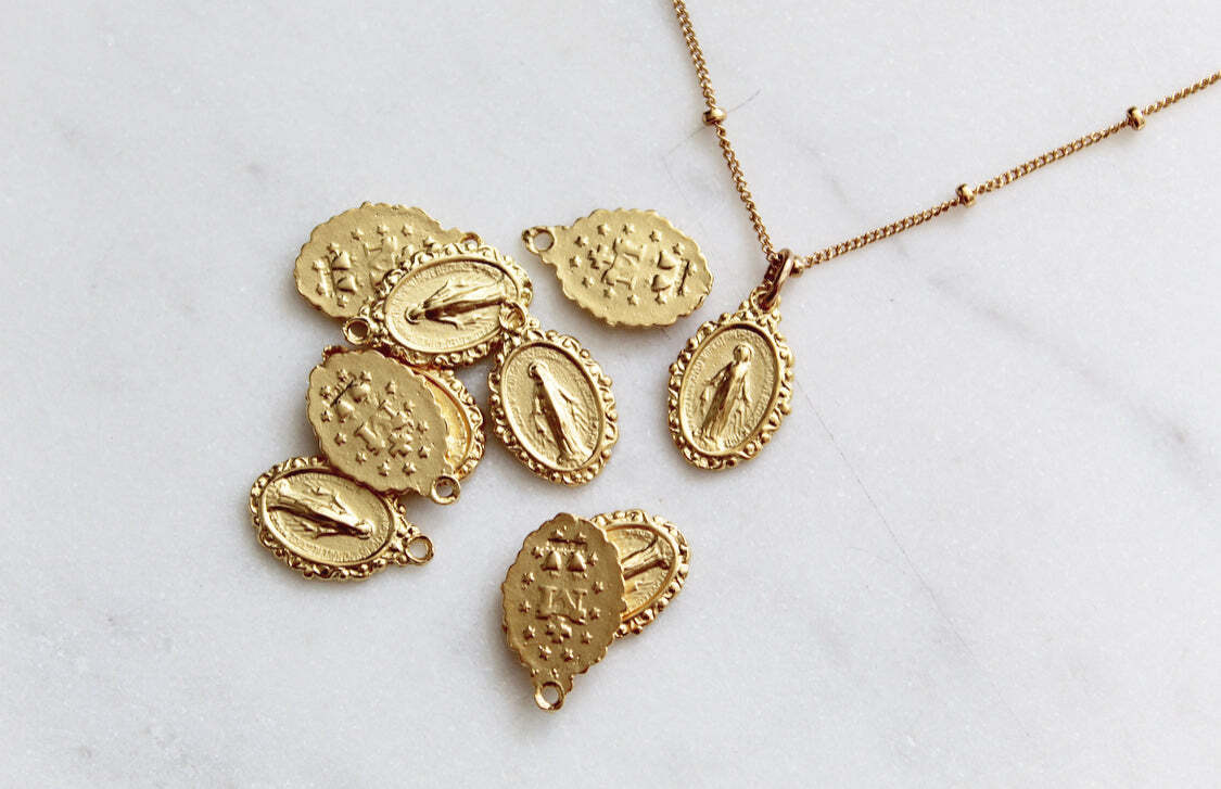 The Miraculous Medal given to St Catherine Laboure from Our Lady who promised all who wear this image will receive great graces. The front of the medal stands on a globe crushing the head of the serpent symbolizing her role as the new Eve. The back of the medal with an "M" below a cross where Mary stands firm at the foot with all of us who worship her Son, Our Lord.