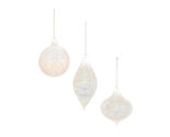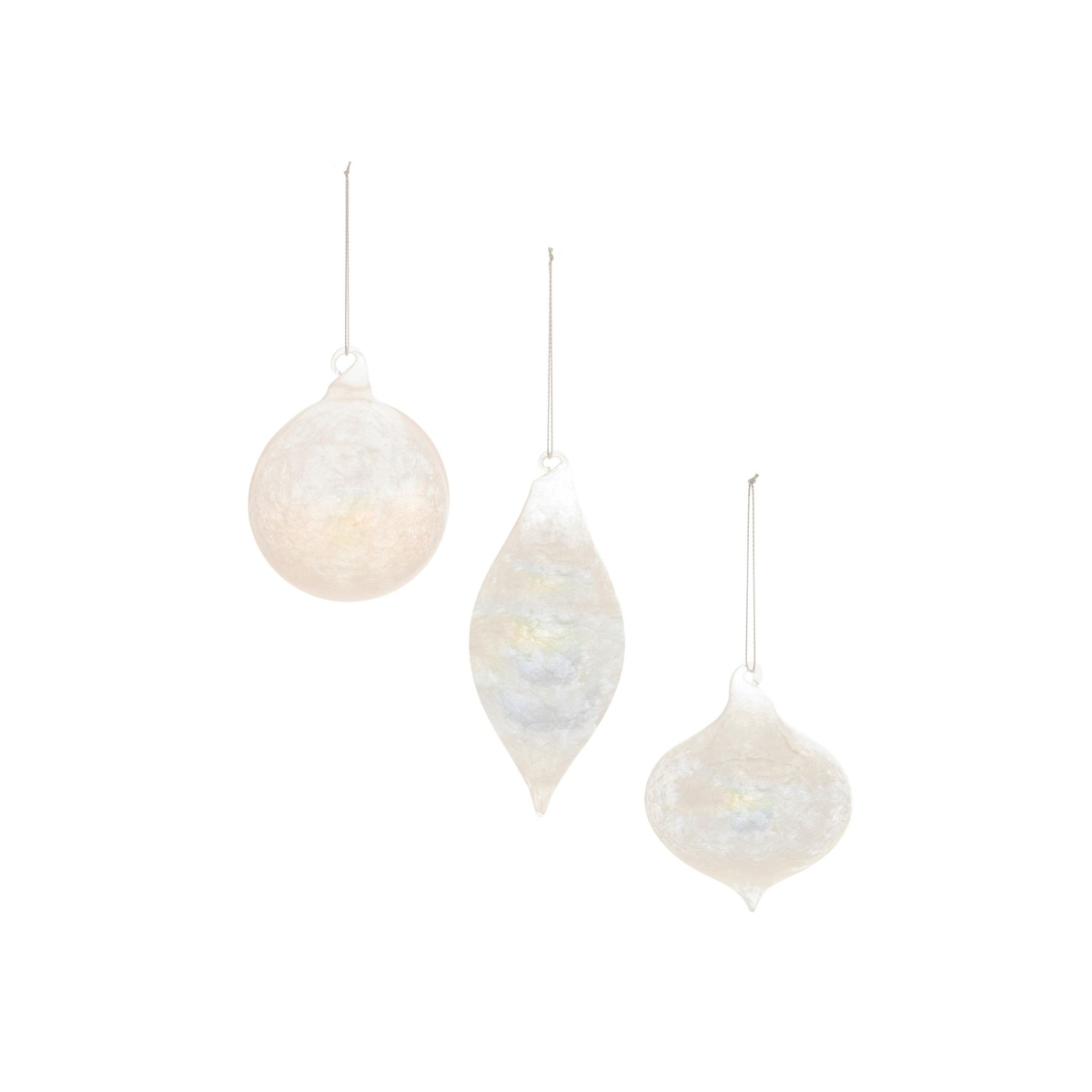 Enhance your holiday decor with the ethereal beauty of these Iridescent Cloudy Glass Ornaments. Featuring soft gray, white, and ivory tones, these ornaments showcase a chic iridescent finish and a delicate cloudy design that adds an airy, modern feel to your seasonal display. The set includes three assorted designs classic ball, elegant onion, and a unique shape each with a swirled glass ornament cap and delicate string hanger. Perfect for your Christmas tree, wreaths, or garlands, these ornaments bring a sophisticated, wintry touch to any space.
