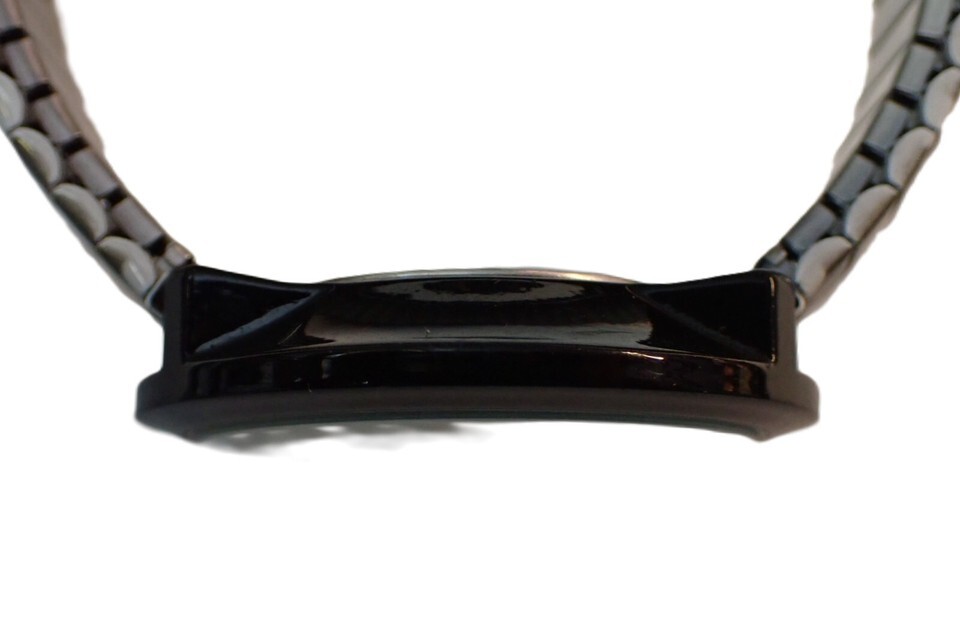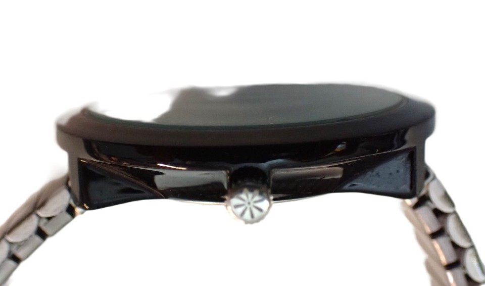 In very good running condition is as shown in the photographs of the actual watch. The case diameter is 40 mm and has silver dial with silver toned hands and markers. The mineral crystal is clean, no marks, has Japan movements and has a flexible stainless steel band with polka dots as shown.