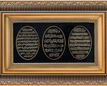 This beautiful art decor piece features three different important Islamic writings: Ayatul Kursi, Nazar dua, and Abundance Dua (Bereket). Script is embossed in gold color on a black background, and displayed in a gold frame. Due to the manufacturing process and hand-finished detailing, this item may have minor imperfections. Made in Turkey.