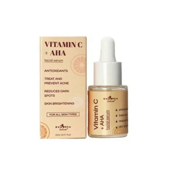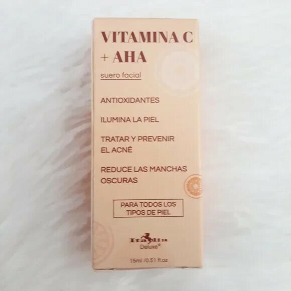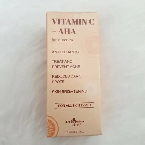 Italia Deluxe "Vitamin C + AHA" Skin Brightening Facial Serum ~ NEW SEALED!!! For All Skin Types -Antioxidants -Reduces Dark Spots -Treat and Prevent Acne -Skin Brightening Directions Apply a few drops over face and neck before moisturizing day night. Shipped from a smoke free environment.