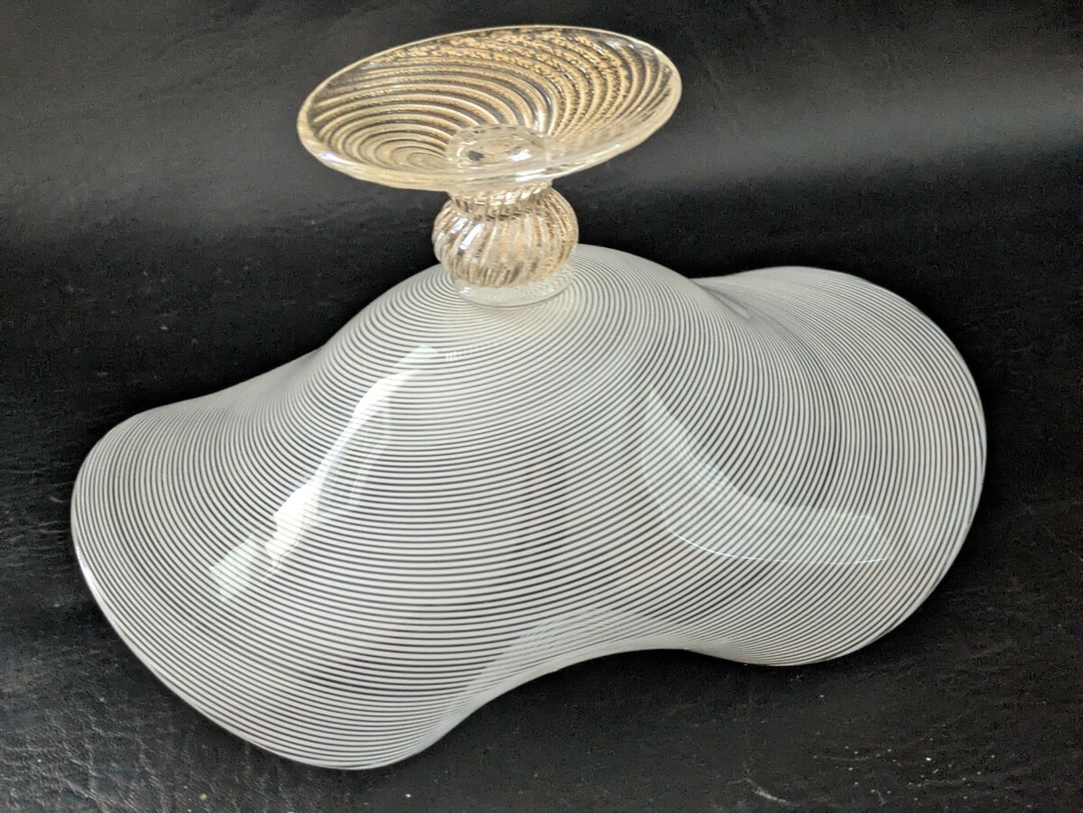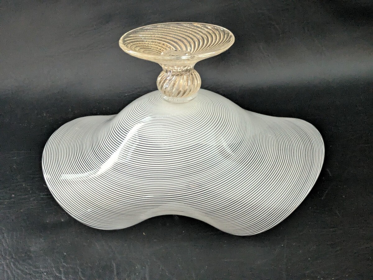 This product is a unique Murano glass bowl, hand-blown in Italy with a clear glass body accented with metallic gold details. The modern and abstract design showcases the artistry and craftsmanship of traditional Italian glassmaking techniques. Measuring 22 cm in diameter and 16 cm in height, this stunning piece adds a touch of elegance and sophistication to any home decor setting, making it a standout decorative accent for those who appreciate the beauty of abstract art.