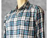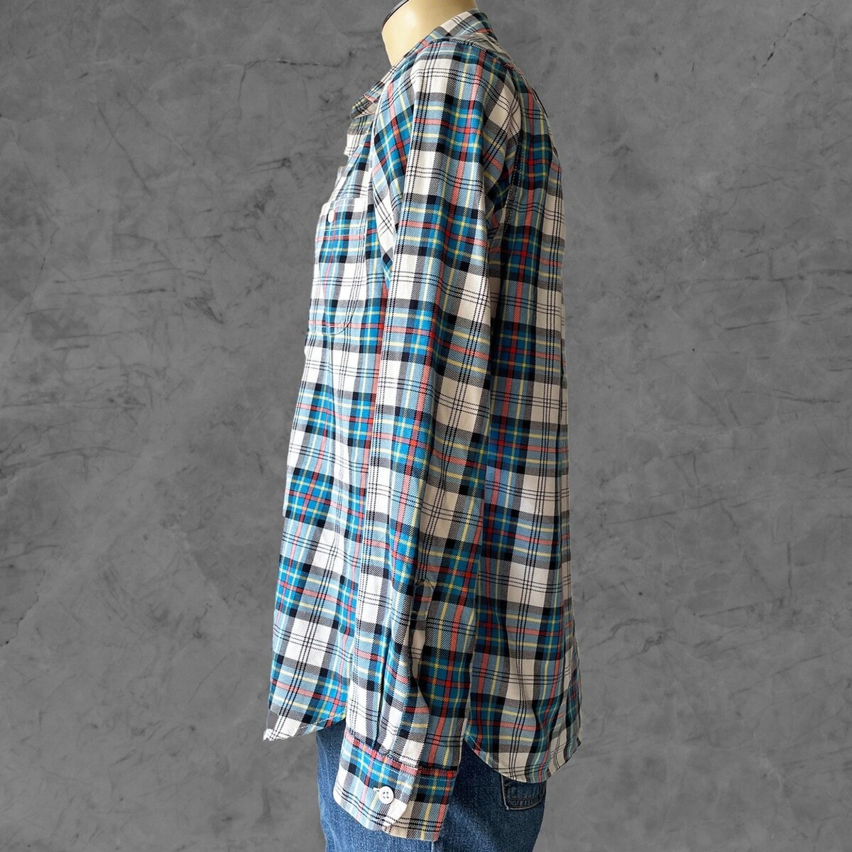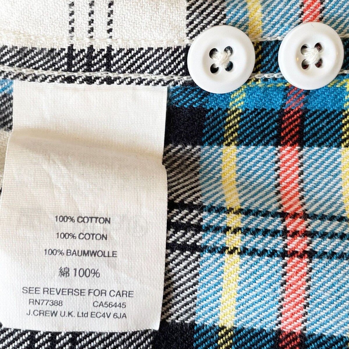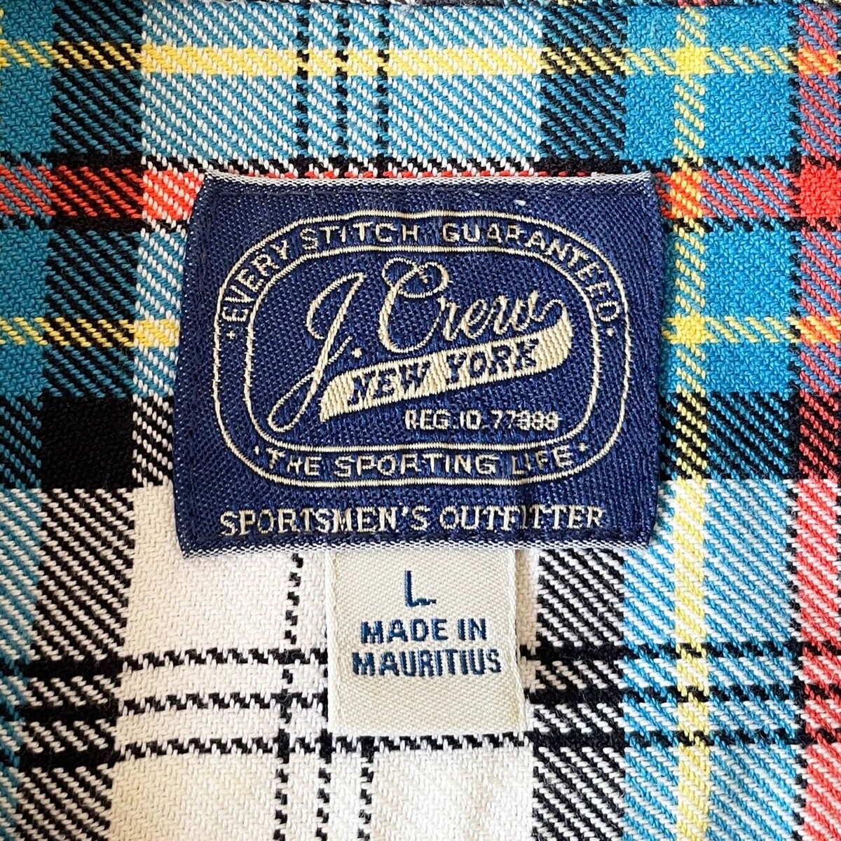 J Crew men's size LARGE plaid midweight cotton flannel shirt, colors turquoise blue, red, yellow, black and white. Excellent condition. 100% cotton, machine wash.