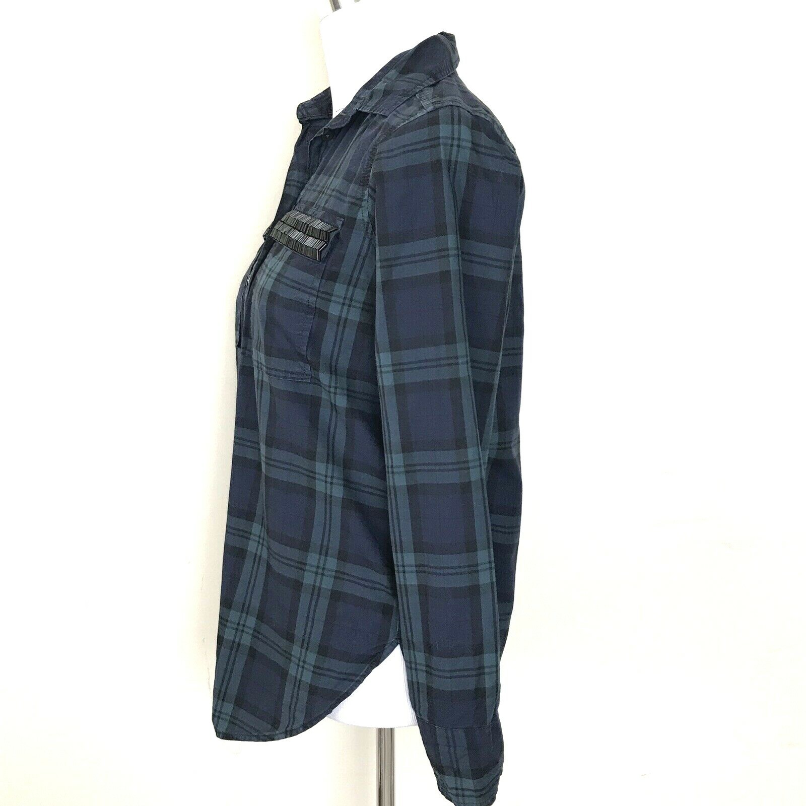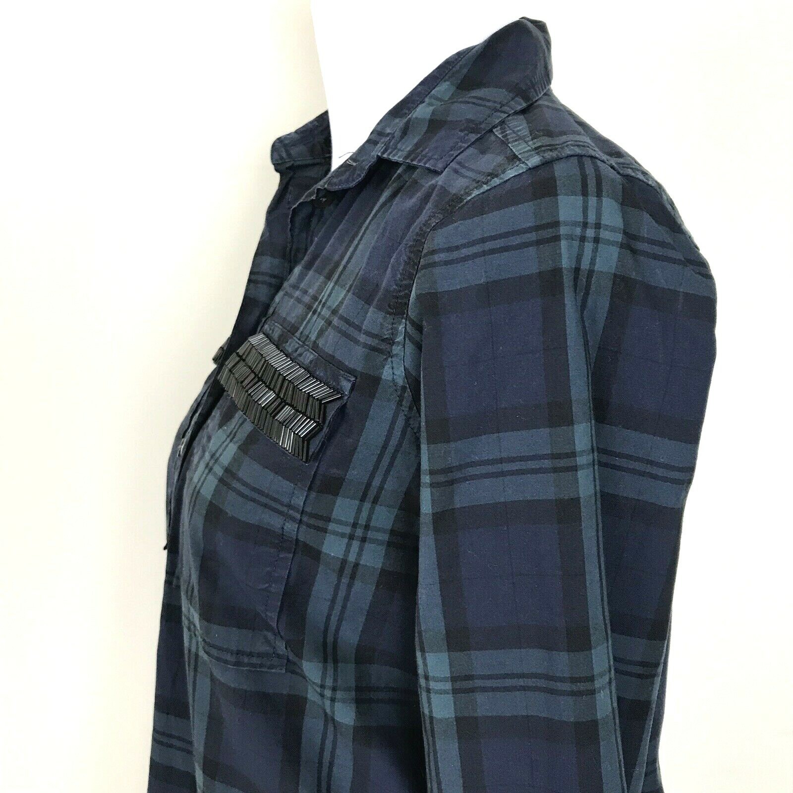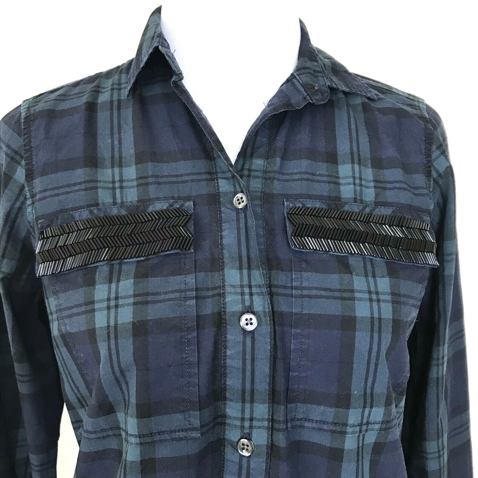 J Crew Popover Top Womens 00 Blackwatch Plaid Shirt Beaded Chevron Green Blue