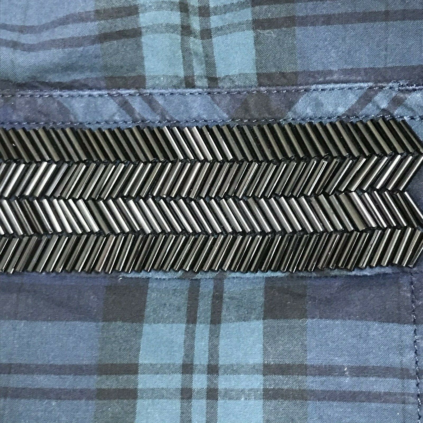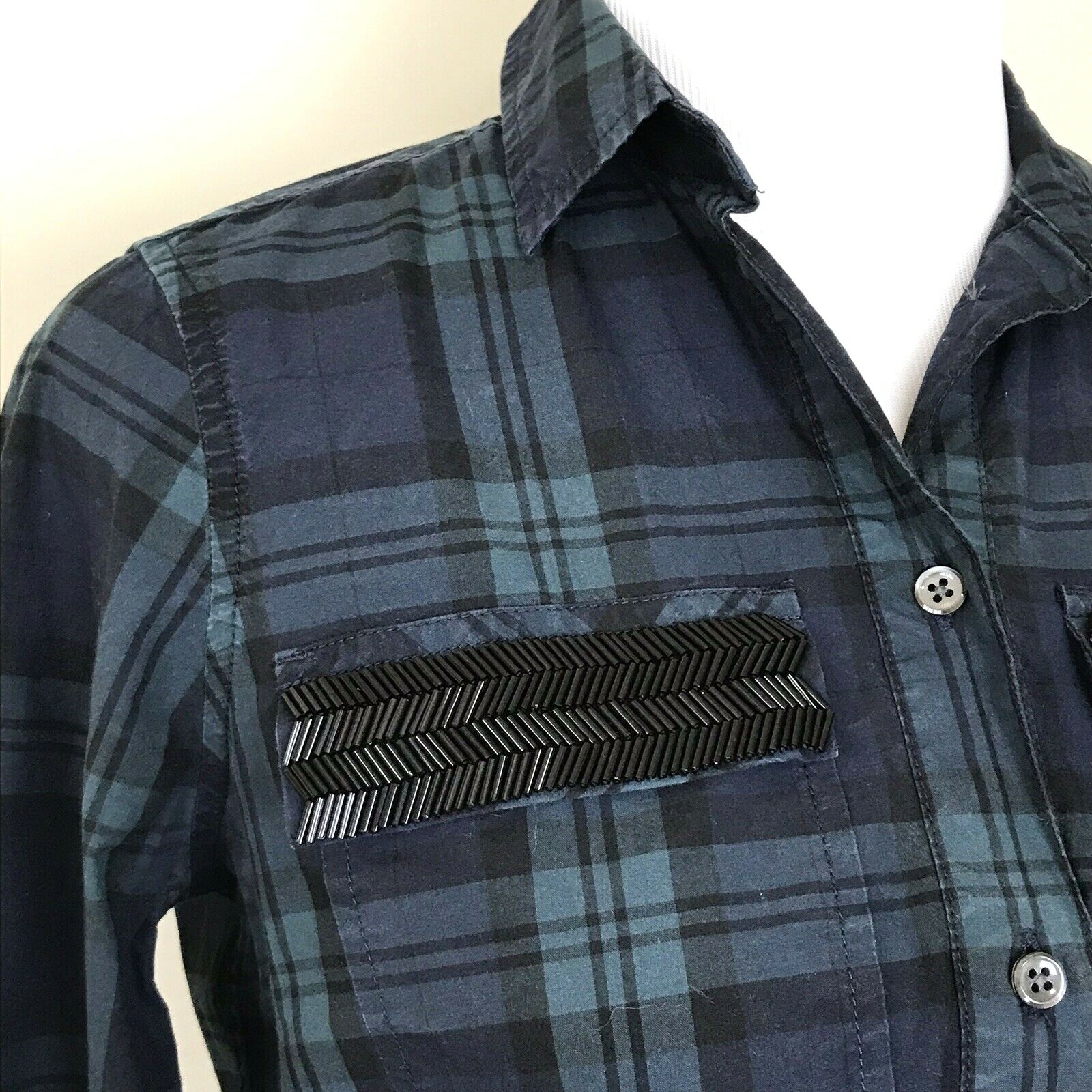 J Crew Beaded Chevron Popover Shirt - Green and blue blackwatch plaid. The classic plaid popover gets a little fancy with hand-applied bugle beading at the pockets.