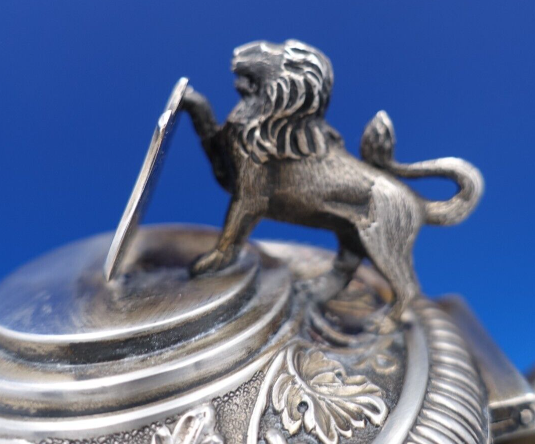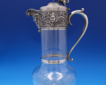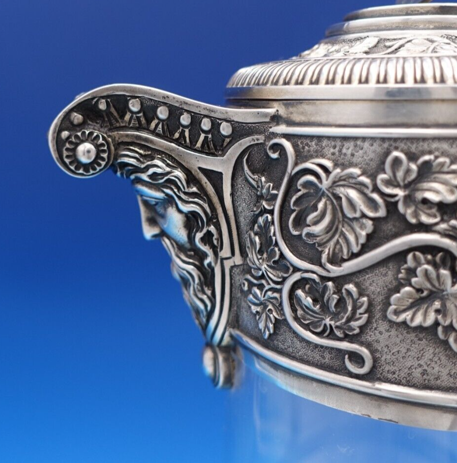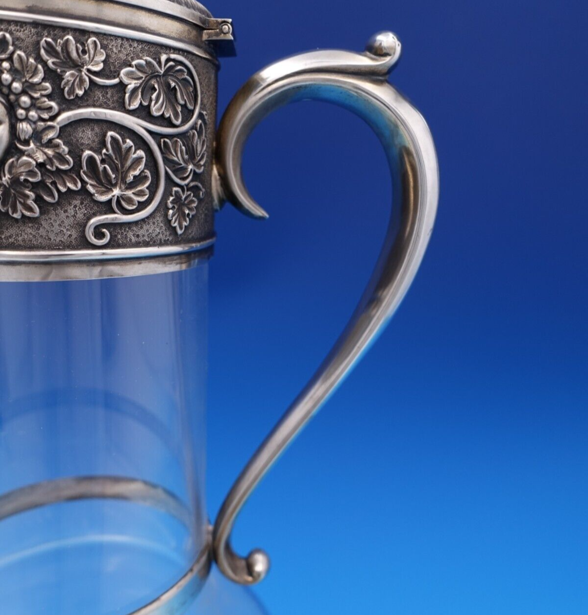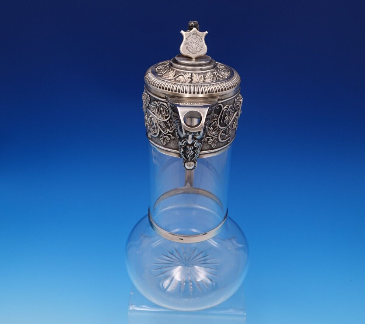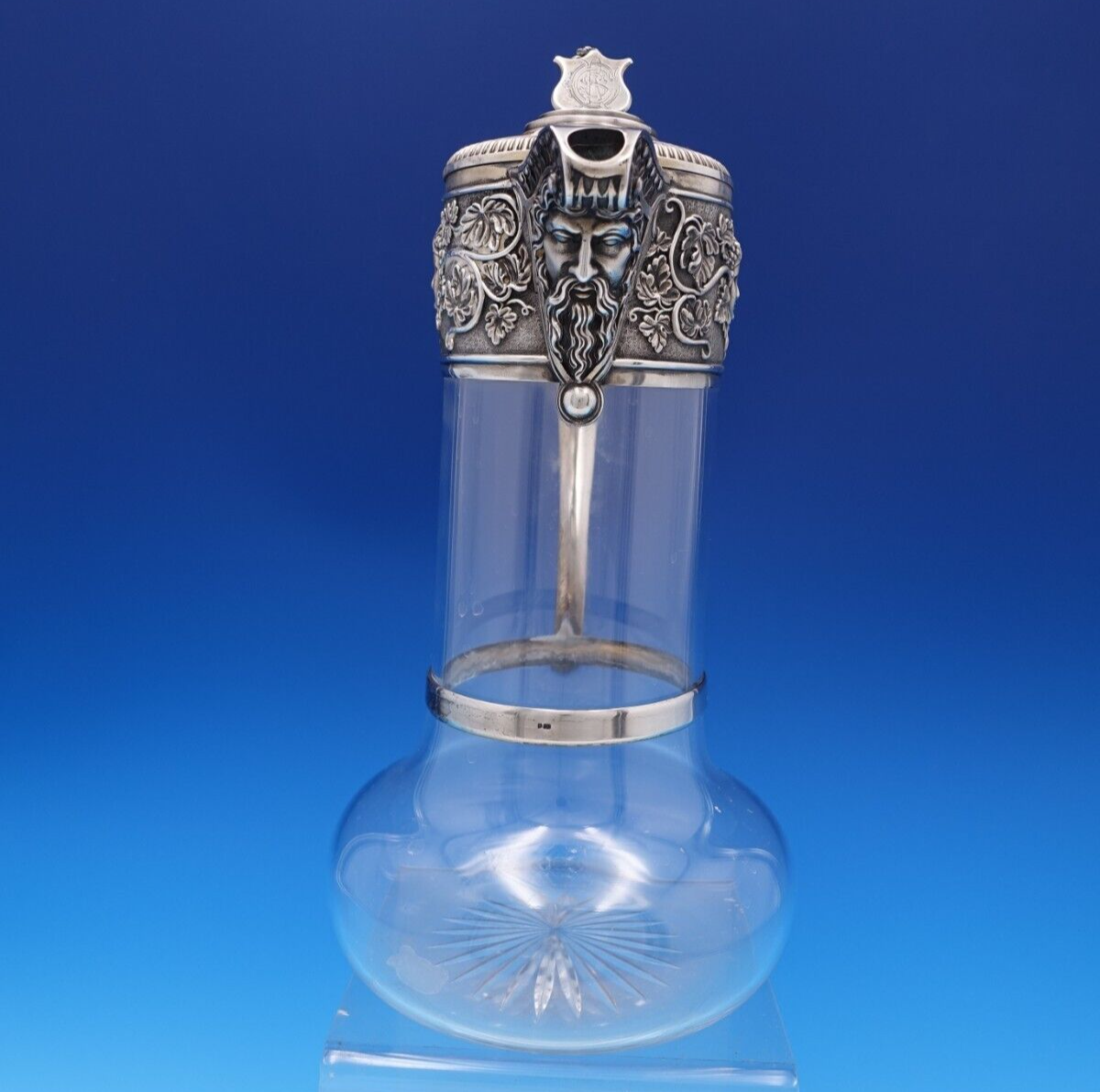 Extraordinary John Grinsell and Sons sterling silver and glass claret wine decanter pitcher made in Birmingham circa 1890. This piece features a 3-D lion finial with monogram on shield (see photos). It also has a man's bearded face on the spout, and grapes and vines with two faces on the beautiful wide border.