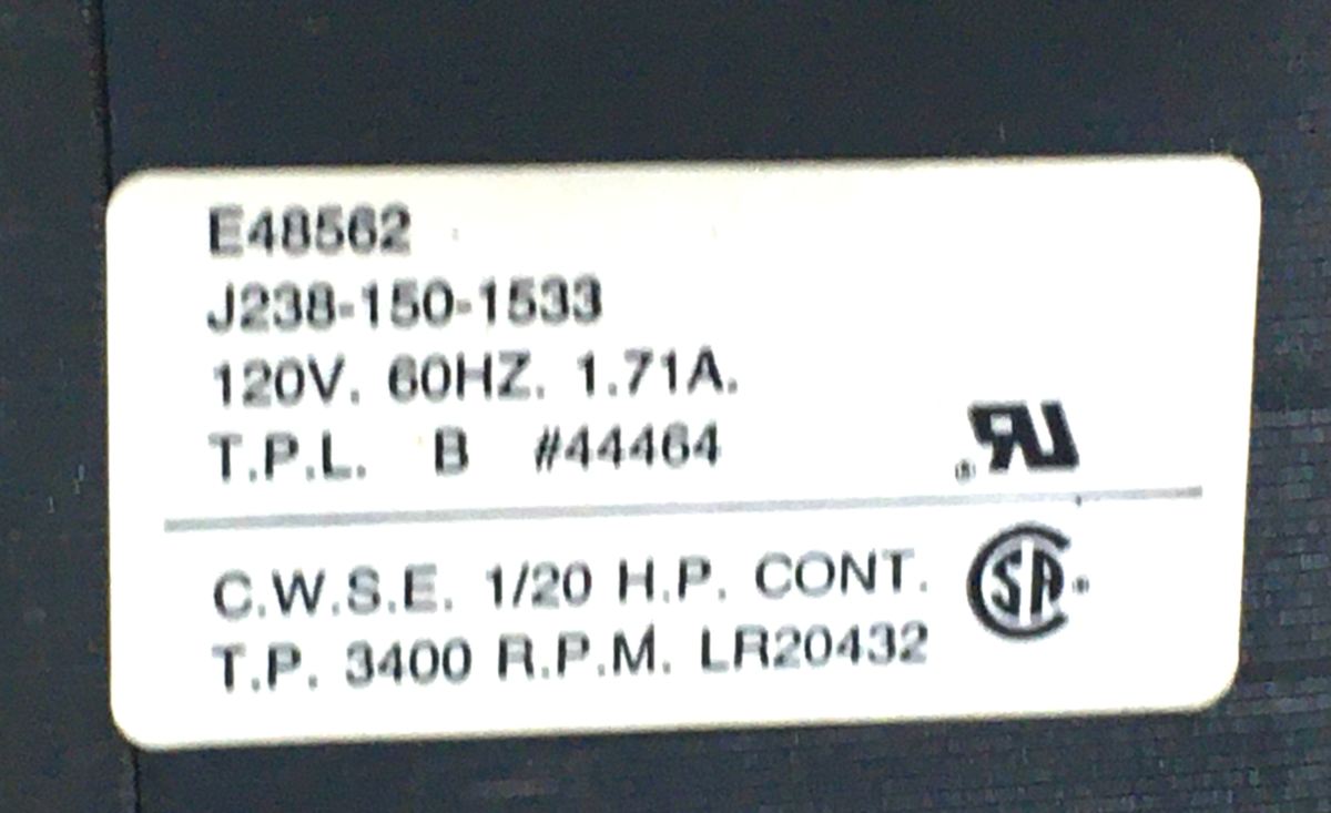 This is JAKEL 117104-01 DRAFT INDUCER BLOWER J238-150-1533 44464 120V 1/20HP 3400 RPM used part.