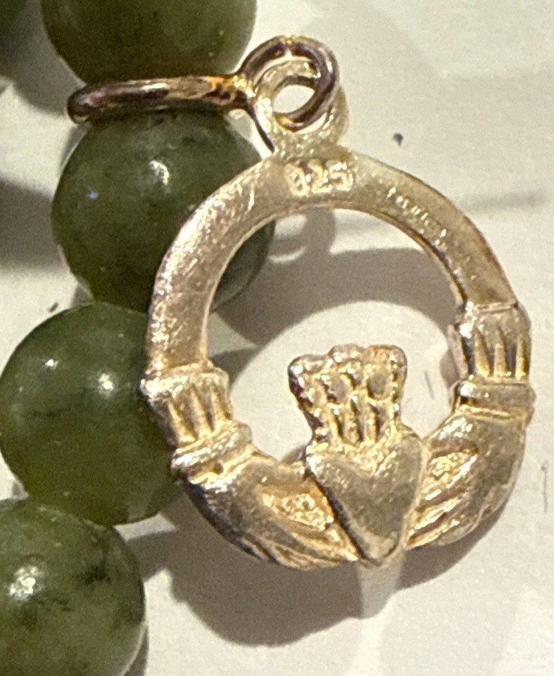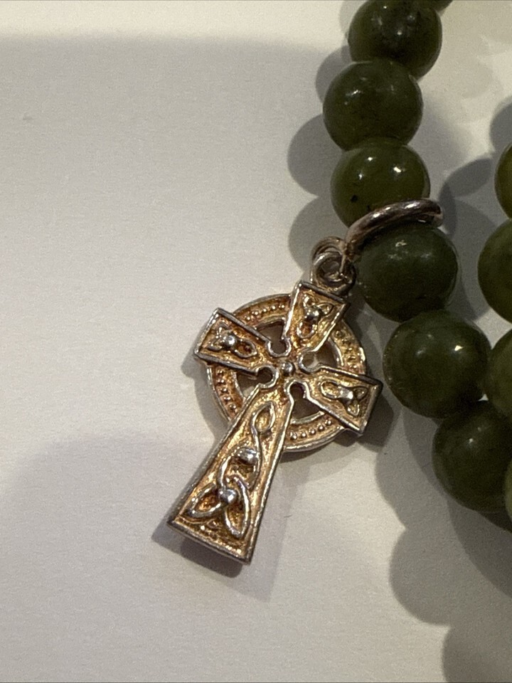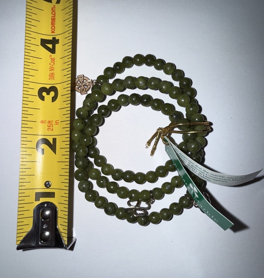 Three bracelets with three unique sterling silver charms: a clover, a claddaugh, and a Celtic cross. Each have a stretchy elastic cord allowing for bit of sizing flexibility. They come with a tag from JC Walsh Sons, a jewelry store of Dublin Ireland. The stone was mined in Lissoughter.