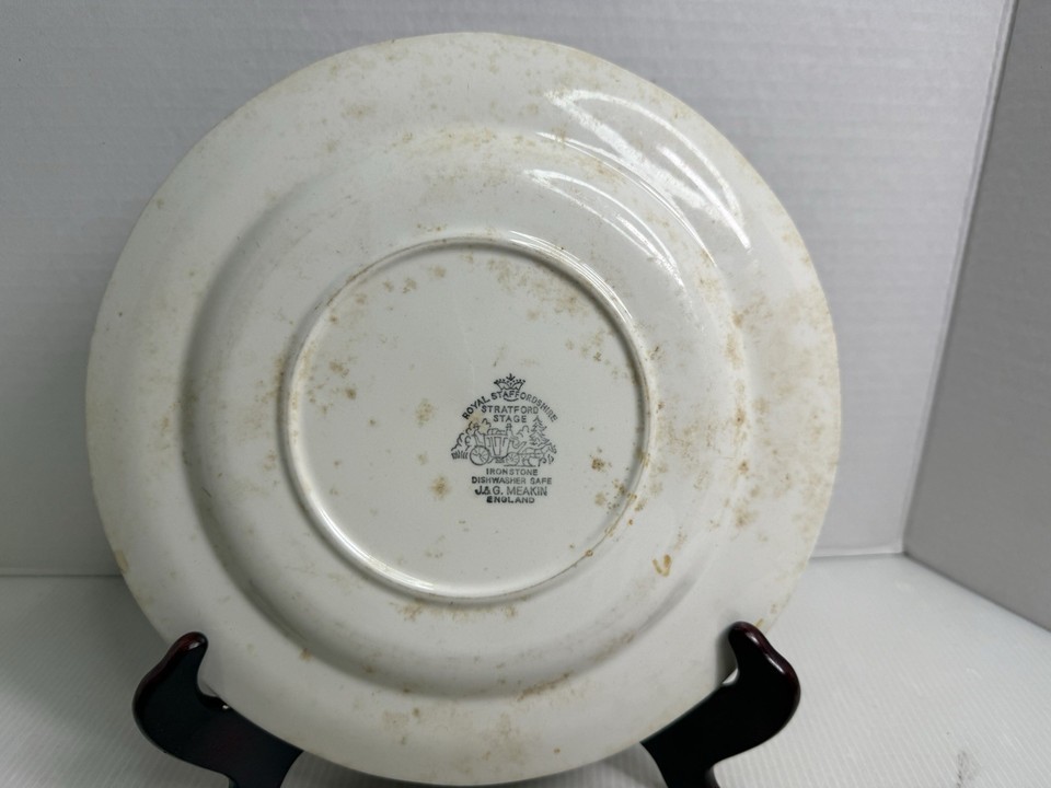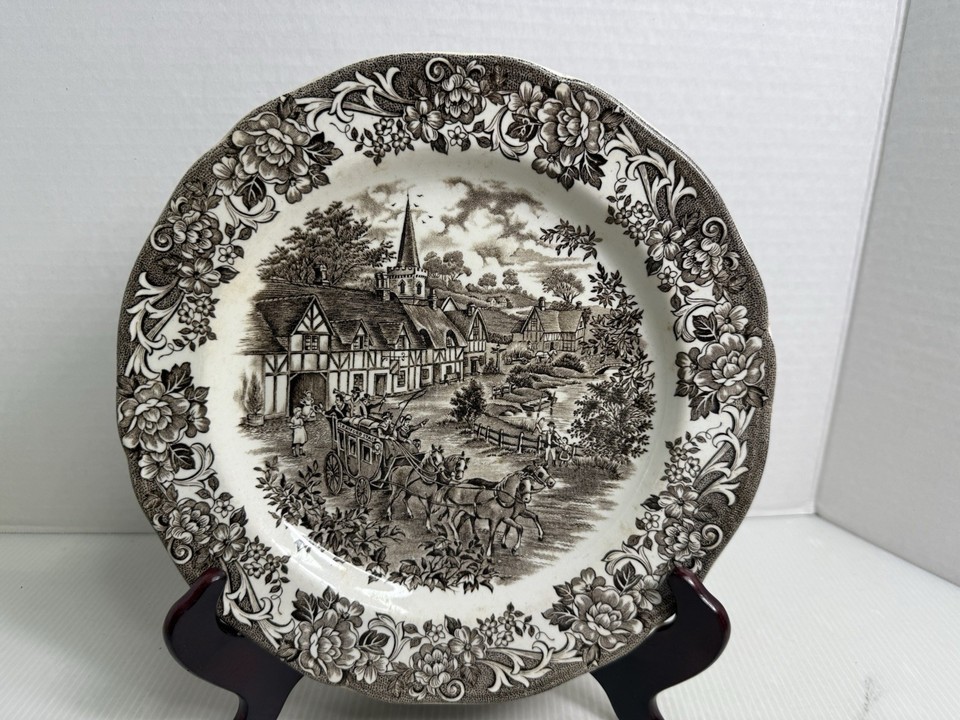 This beautiful dinner plate from JG Meakin's Royal Staffordshire collection features the Stratford Stage Brown pattern. Made from ironstone, this plate is a durable and glossy piece that is perfect for all occasions. Measuring at 10.5 inches in diameter, it is a round, vintage plate that is sure to impress your guests. The backstamp is printed and the plate is an original piece from the United Kingdom. Stand not included, no chips are cracks, but the back has discoloration. See all pictures.
