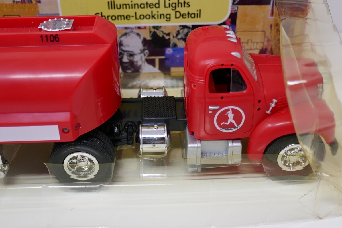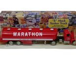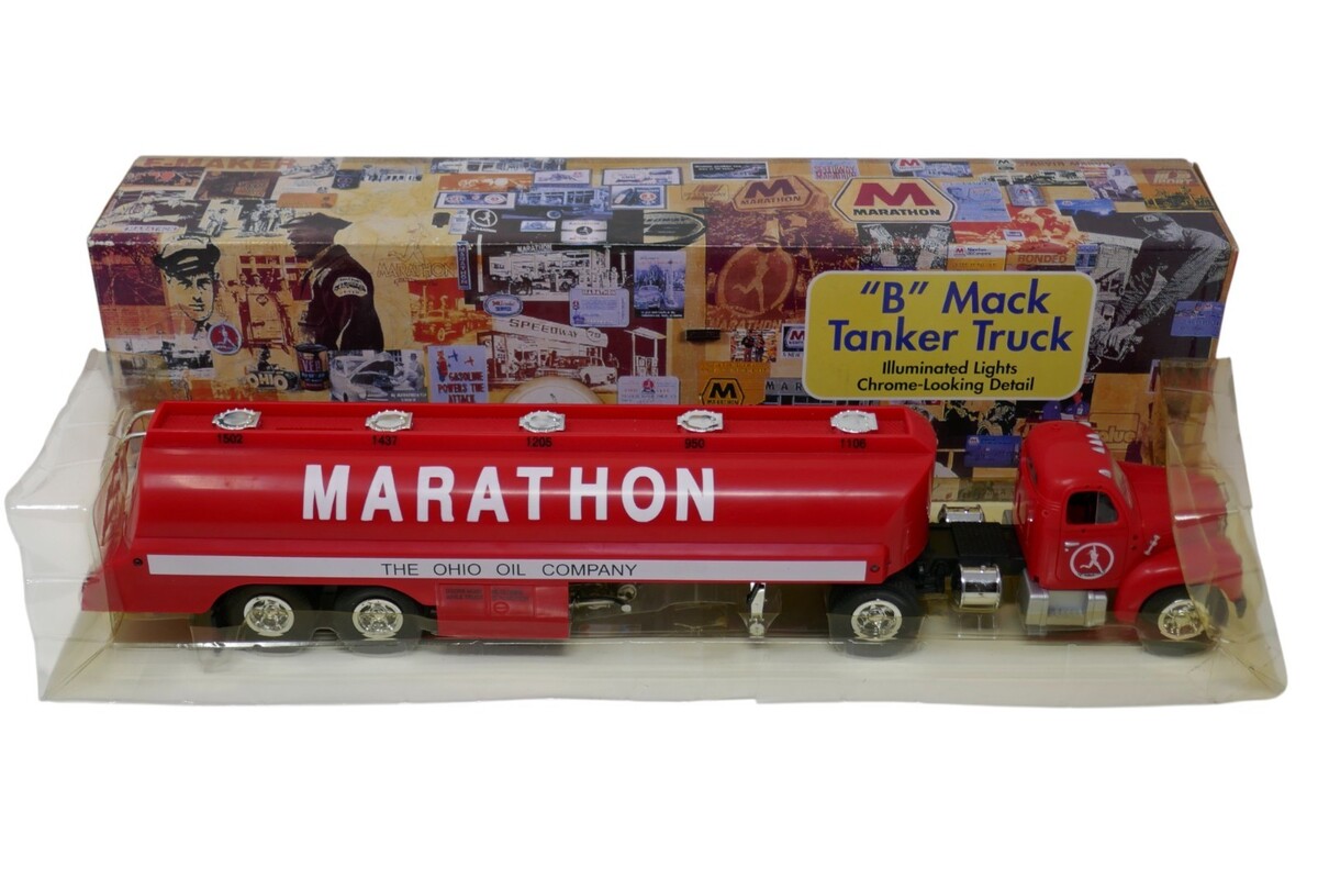 The JMT Replicas Marathon B Mack Tanker Truck Bank is a highly sought-after collectible item, limited to only 2700 units. Removed from the box for pictures. This 16" truck model is a perfect addition to any transportation or truck enthusiasts' collection. With its detailed design and limited availability, it makes for a valuable and unique piece for collectors to cherish and display.
