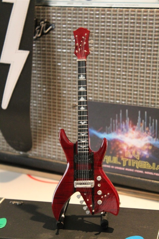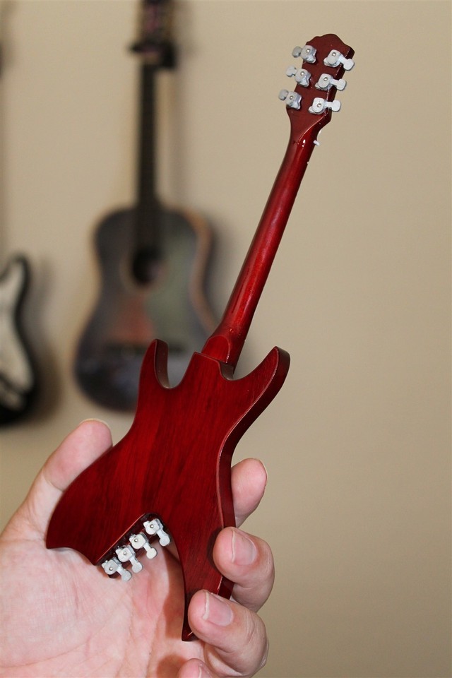 This miniature 1:4 scale replica model instrument can fit in the palm of your hand. It is approximately 10.5 inches in length and comes with a display stand. Each guitar is individually handcrafted from solid woods, plastics, resins, etc. (depending on the guitar style) with plastic tuning keys. Check out our listings for guitar hard cases and miniature amplifiers to complete your guitar set-up.