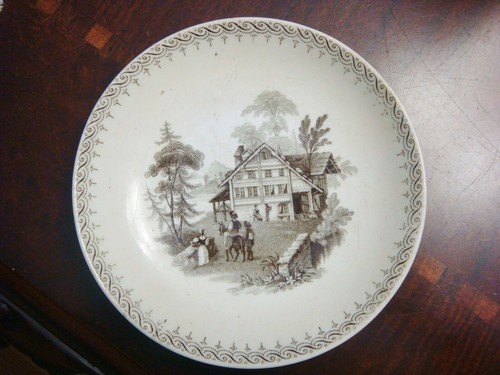 JOHN RIDGWAY Co.Staffordshire, UK - c1830-1855 dish, 5 1/2" diam black/dark brown transferware country scene, very good condition, some light surface scratches commensurate with age [94B-BSKTRACK5]