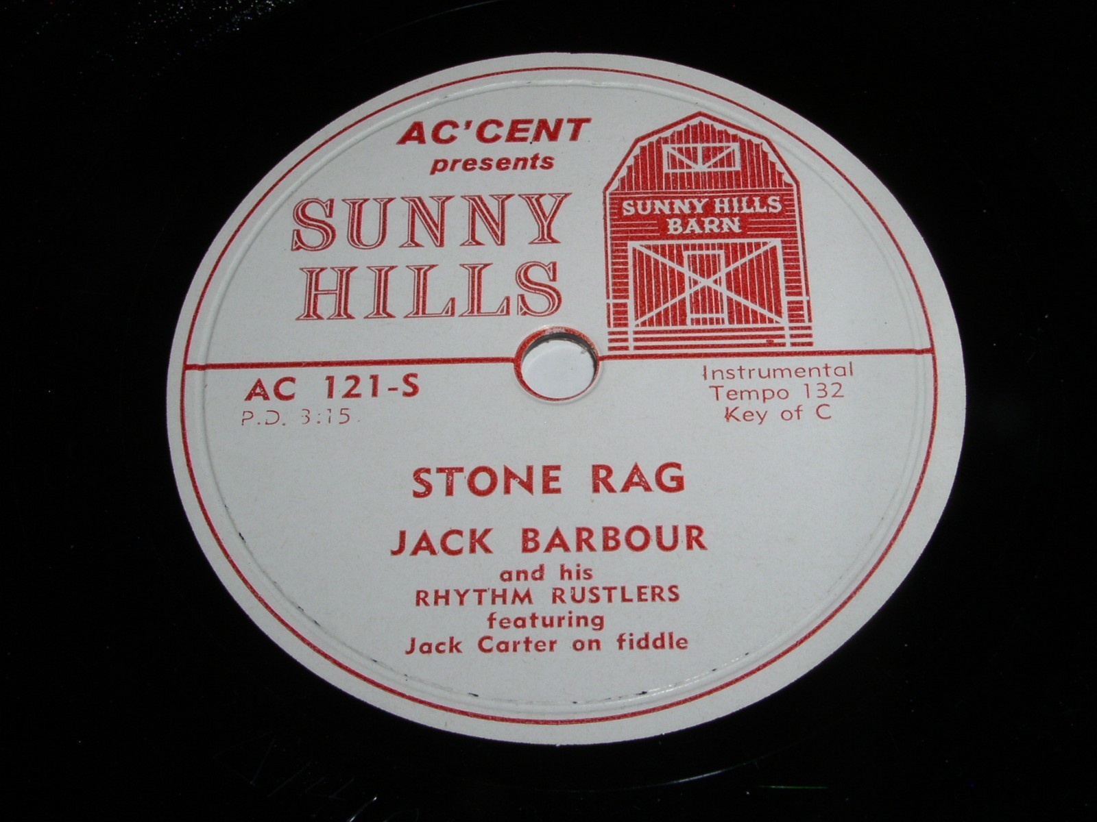 This is a vintage 78 Rpm phonograph record by Jack Barbour and his Rhythm Rustlers entitled, "Stone Rag". Flipside: "Bully Of The Town". Featuring Jack Carter on fiddle. Record label: Sunny Hills AC 121. Comes in its original candy-striped sleeve as shown.