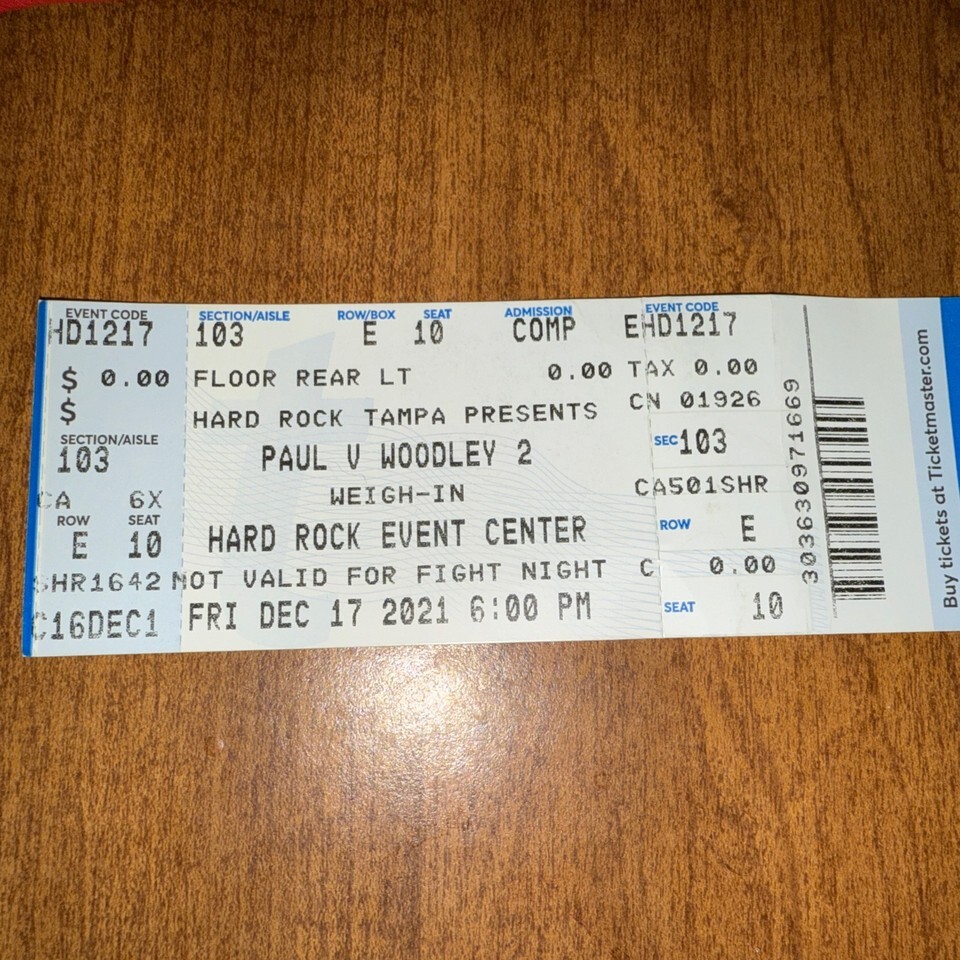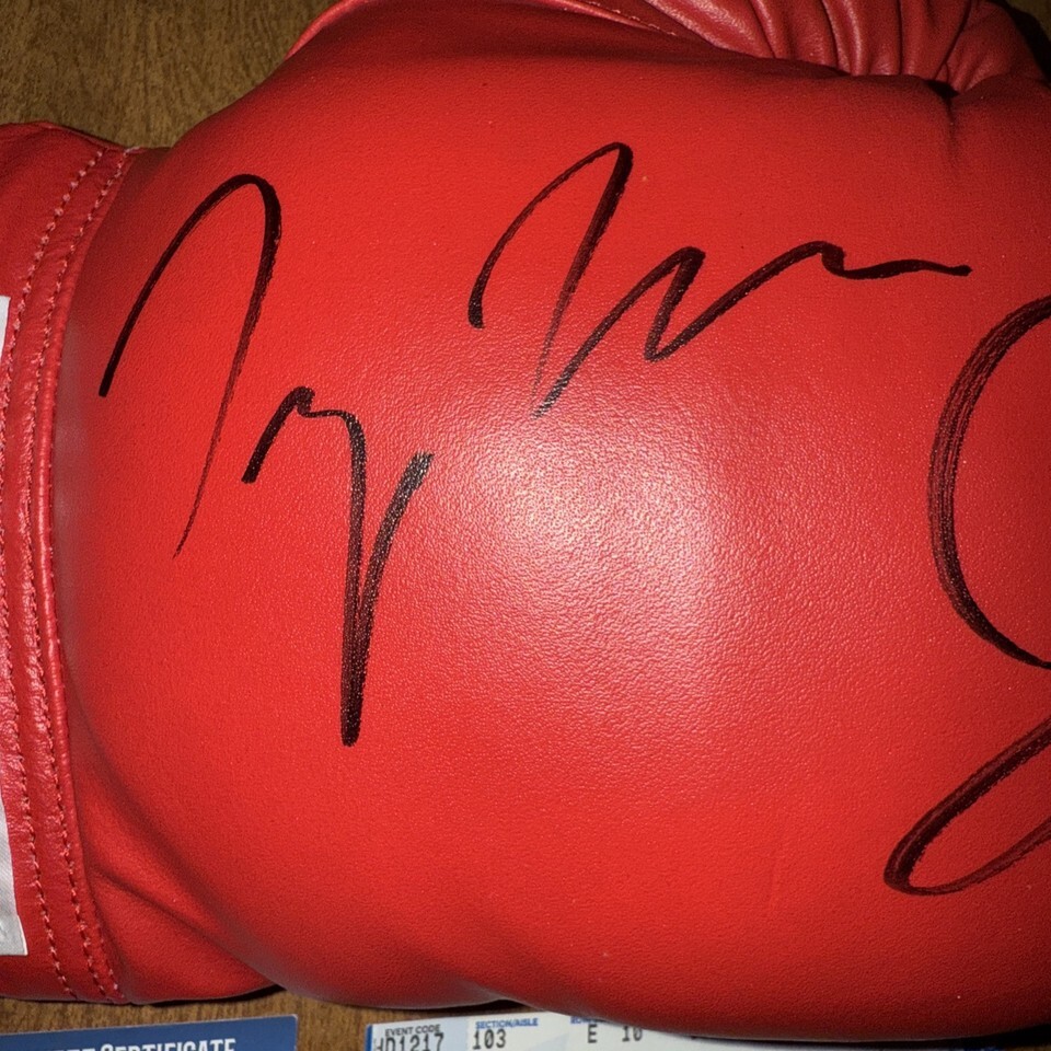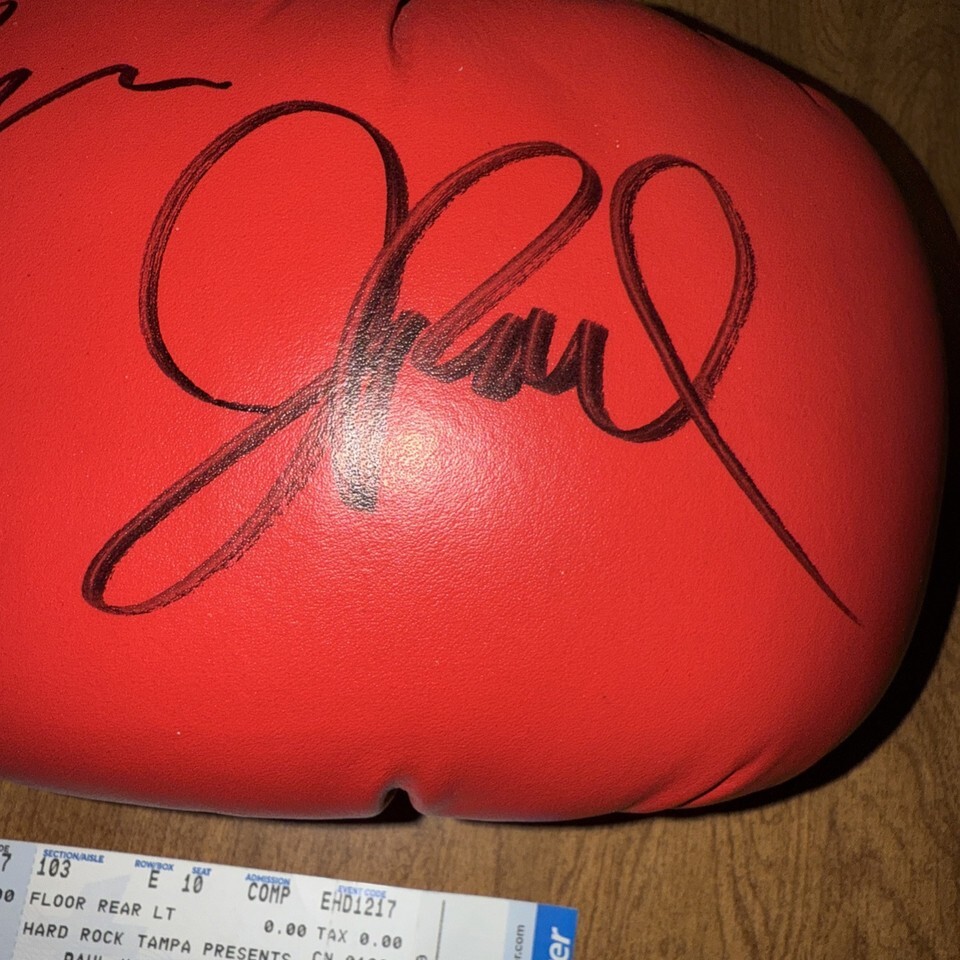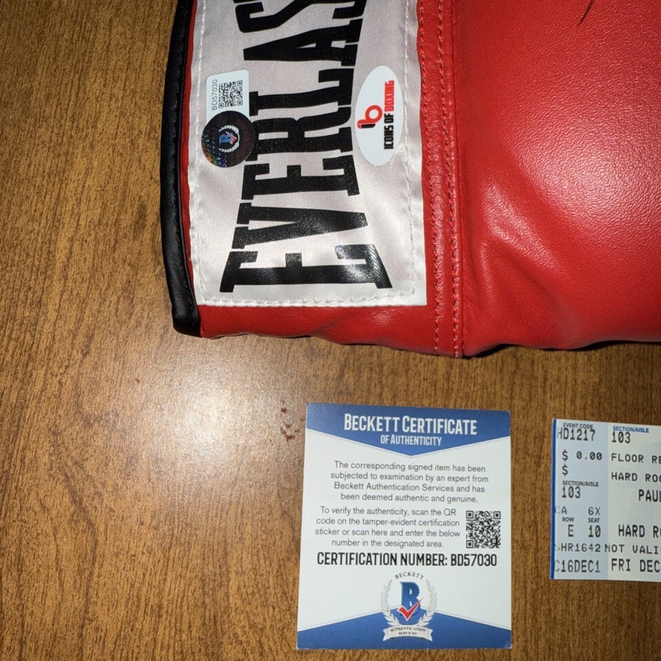 The glove has been autographed by Jake Paul and Tyron Woodley. It also comes with a weight in ticket stub and has been certified by Beckett so that you know it?s authentic.
