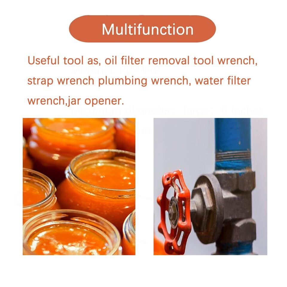 MultifunctionUseful tool for most applications, oil filter removal tool wrench, strap wrench plumbing wrench, water filter wrench.Also great for seniors with weak hands and arthritis who have difficulty opening jars.It is a great helper for you in your home kitchen and restaurant.