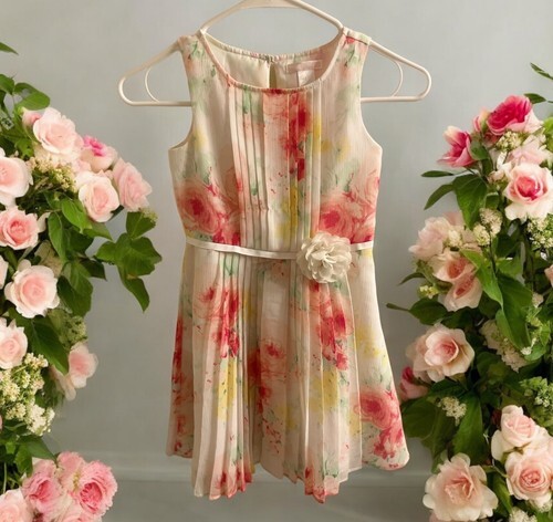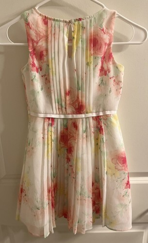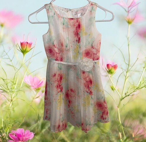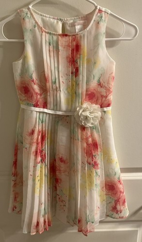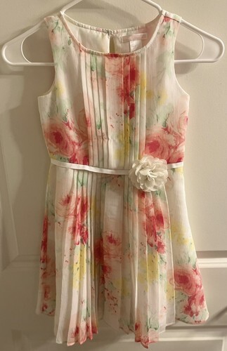 This Janie and Jack dress is perfect for any special occasion. The pink and white floral pattern is cute and charming, making it a great choice for girls. The dress is ideal for parties, weddings, or formal events. This dress is a must-have for any little girl who loves weddings or special occasions. Very good condition and comes from a smoke free home! Pictures taken with and without flash also there is a photo where it shows where at the collar there are a few stitches missing along neckline, hardly noticeable though.