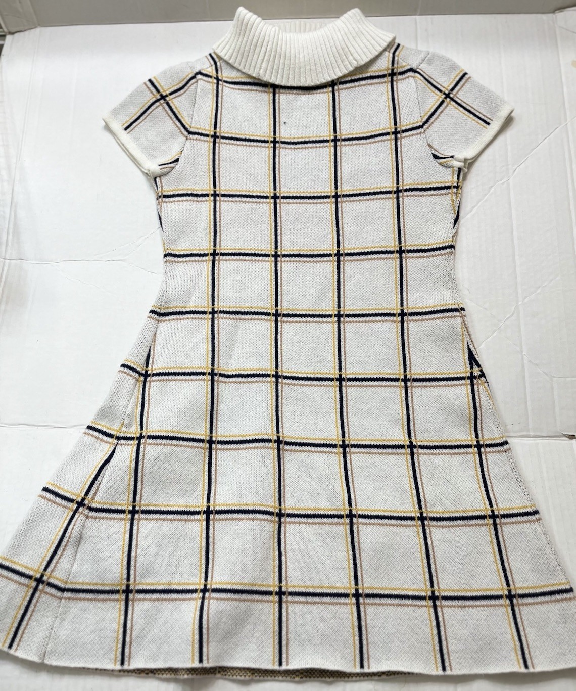 The Janie and Jack Girls Size 7 Sweater Dress is a stylish and versatile outfit for young girls. This dress features short sleeves and a cream, yellow, and brown color scheme, with a cute buckle detail for added flair. Made by the reputable brand Janie and Jack, this sweater dress is sure to make your little one be the talk of the town. Please let me know if you have any questions!
