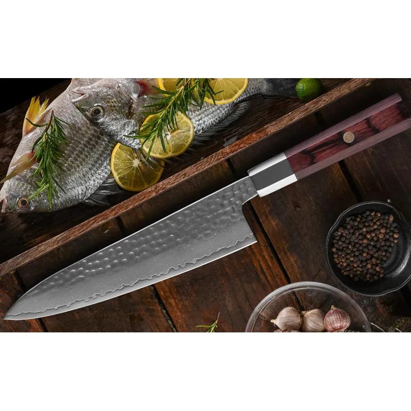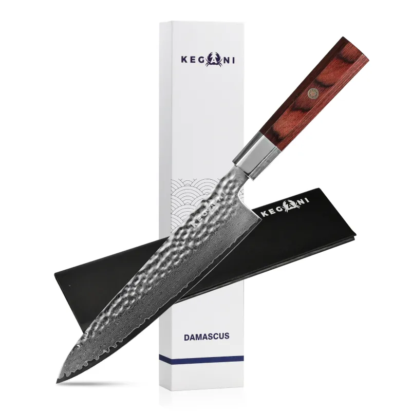 - Premium Materials: Crafted from rare Japanese VG-10 steel, this chef knife offers exceptional sharpness and durability. The Japan Rosewood handle provides a non-slip grip for precise handling.