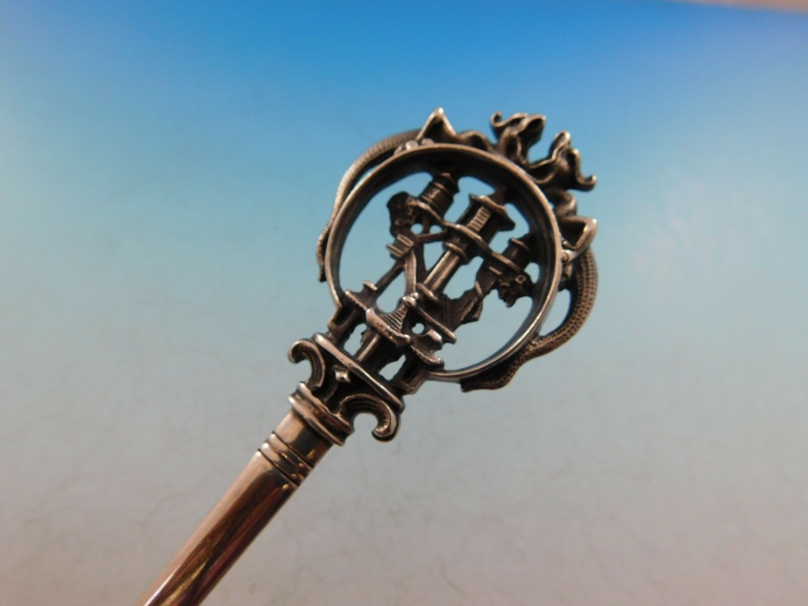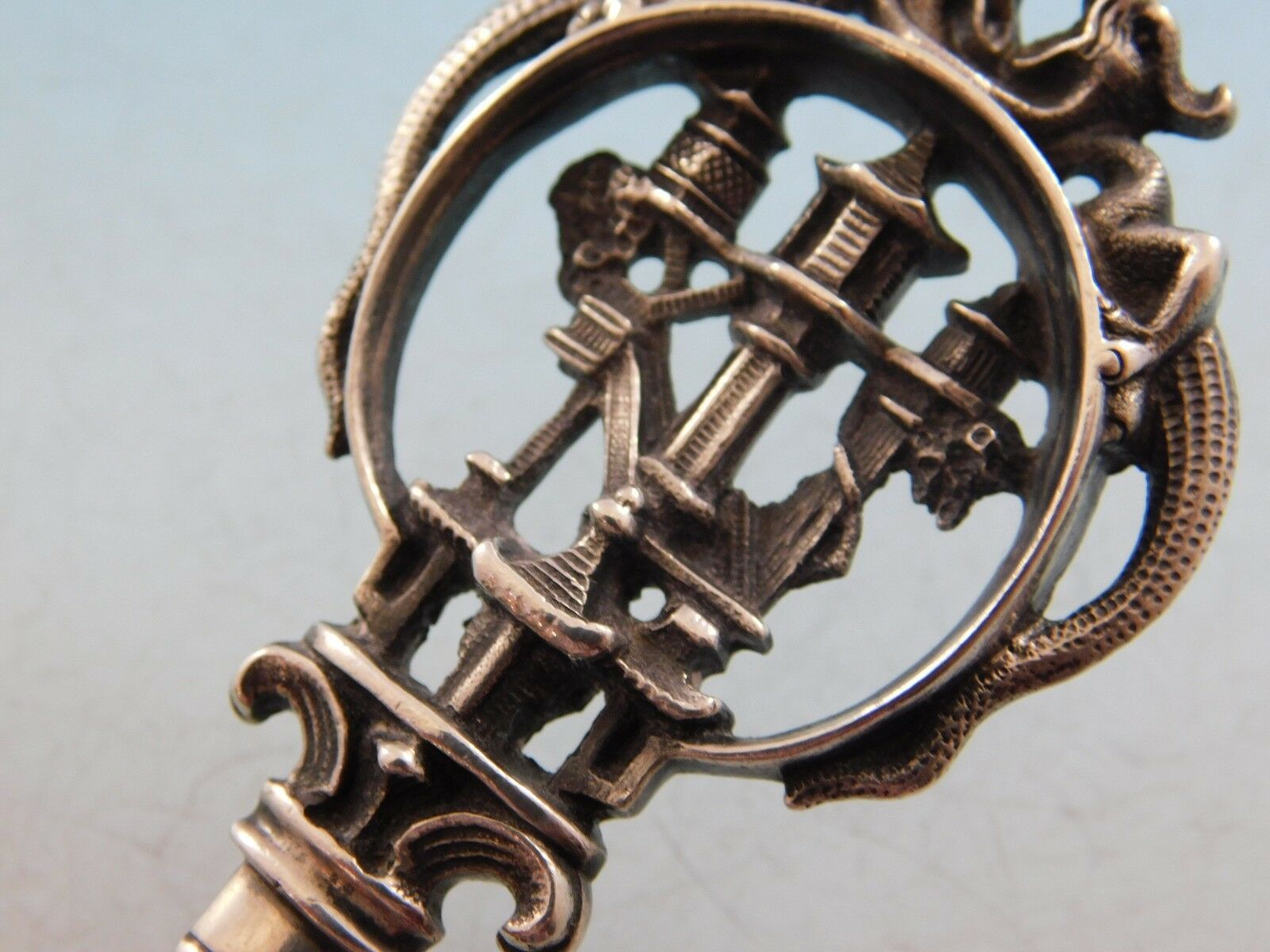 Extraordinary Japanesque sterling silver Pudding Spoon measuring 9 7/8" in the pattern Japanese Pagoda by Wendt. The handle of this piece features a very detailed pagoda within a circle. Two dragons are perched on top of the circle, wrapping their tail around the side. The blade has lovely Japanese brite-cut detailing. It is not monogrammed and is in excellent condition.