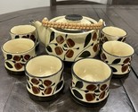 Japanese Style Teapot Bamboo Handle 6 Sake Cup Set Floral brown Stoneware