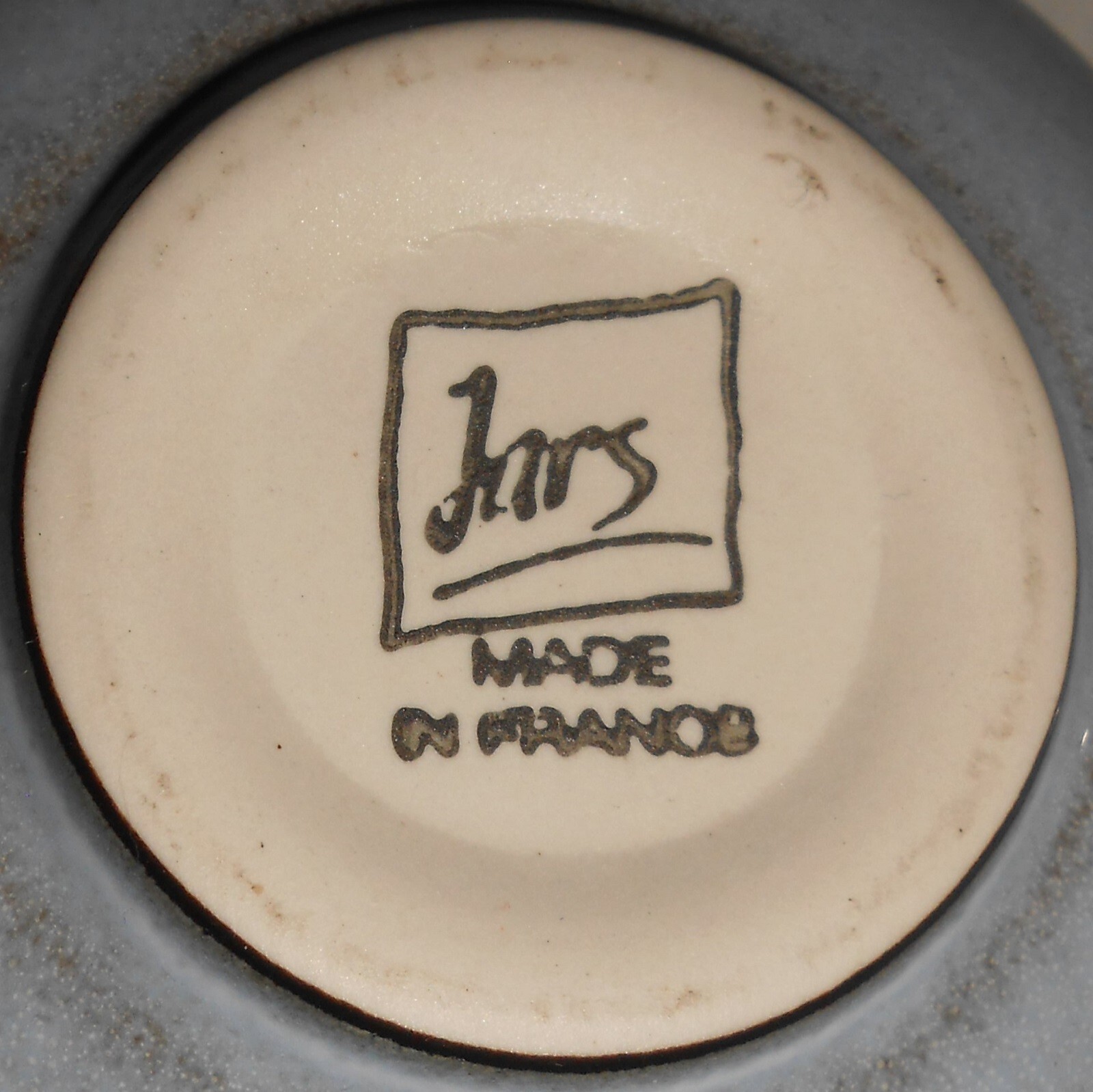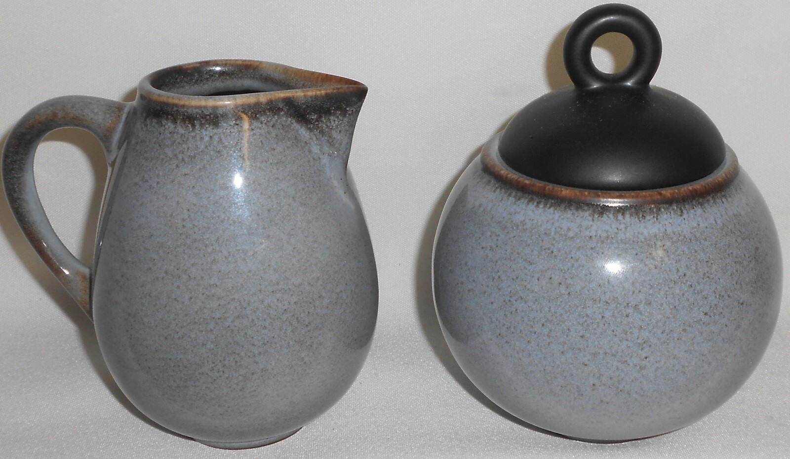 This is the Creamer and Sugar w/Lid Set from JARS in the Tourron Gris Ecorce Pattern and Made in France. The Creamer holds approx 12 oz and measures approx 4 1/2" tall and both Creamer and Sugar w/Lid are in great pre-owned condition with no chips or damage.