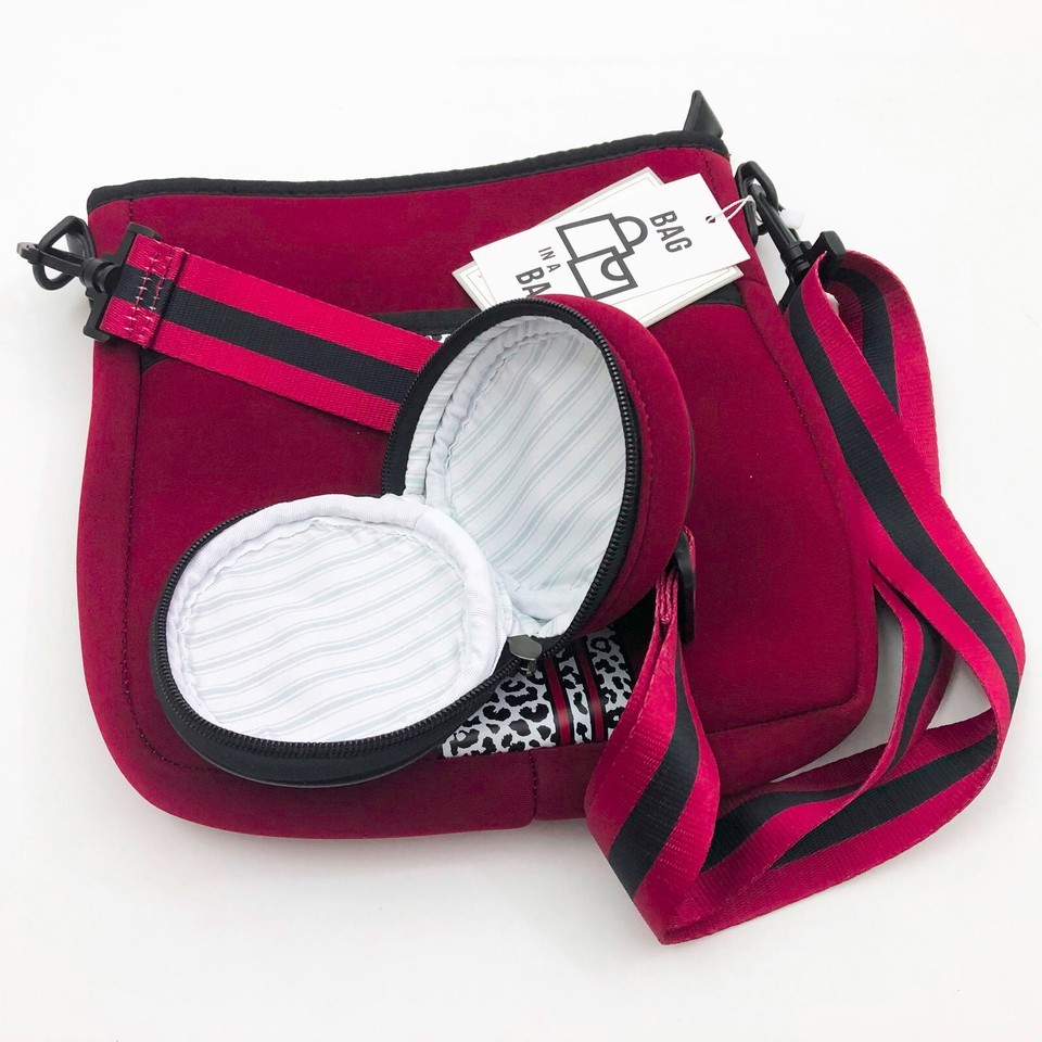 - Jen & Co. Neoprene DRU Burgundy Cheetah Print Cross Body Bag in a Bag