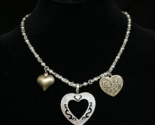 Charms include: antique gold-toned 3D heart, antique gold-toned flat etched design heart, and flat pewter-like die cut heart