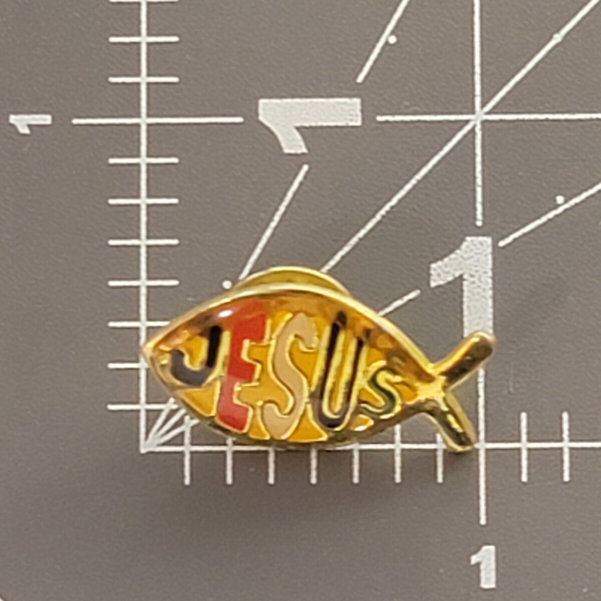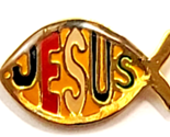 - Jesus Fish Ichthys Gold Tone Multicolor Lettering Pin Christian Religious VTG