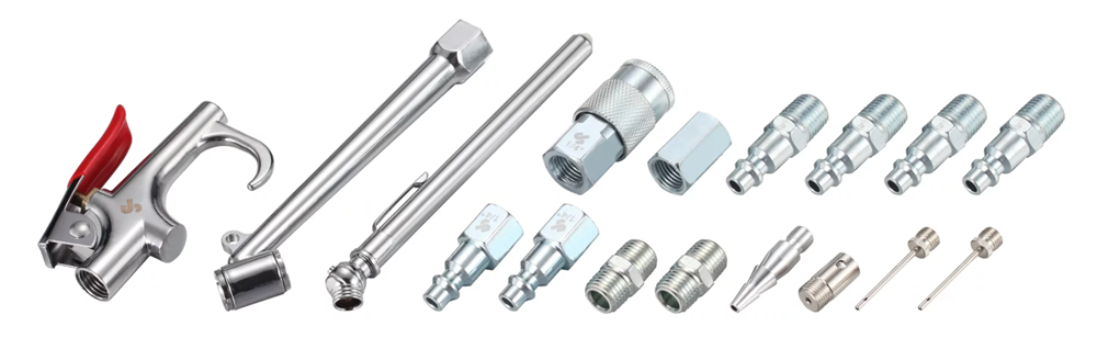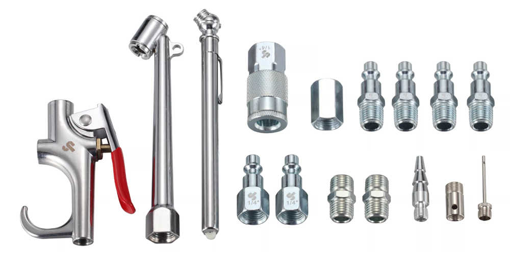 (1) 1/4 in. Female coupler, (4) 1/4 in. Male plugs, (2) 1/4 in. Female plugs, (1) Female coupling, (2) Male couplings, (1) Blow gun, (1) Safety nozzle, (2) Inflation needles, (1) Dual foot chuck, (1) 50 PSI Tire gauge, (1) Tapered nozzle