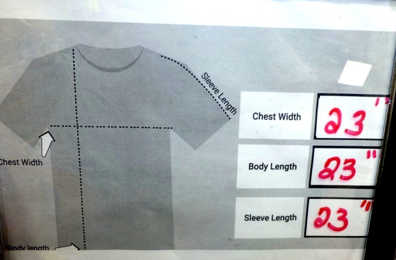 Minor scuffs on the front and back; clean overall. Measurements: Chest Width = 23", Body Length = 23", Sleeve Length = 23".