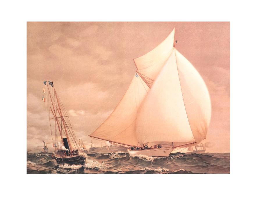 Description: Painted by J. G. Tyler. Copyright 1887 by L. Prang Co. Boston. The title continues with "between the American Sloop Volunteer and the Scotch Cutter Thistle. Distance sailed 20 miles to windward and return. Volunteer wins by 11 minutes 49 1/4 seconds corrected time". Two tables in the title margin give the dimensions for each of the yachts.