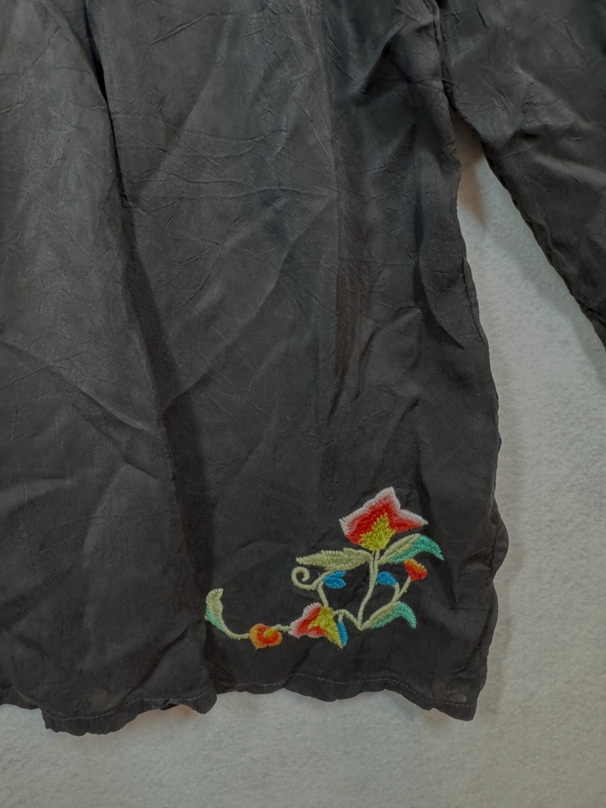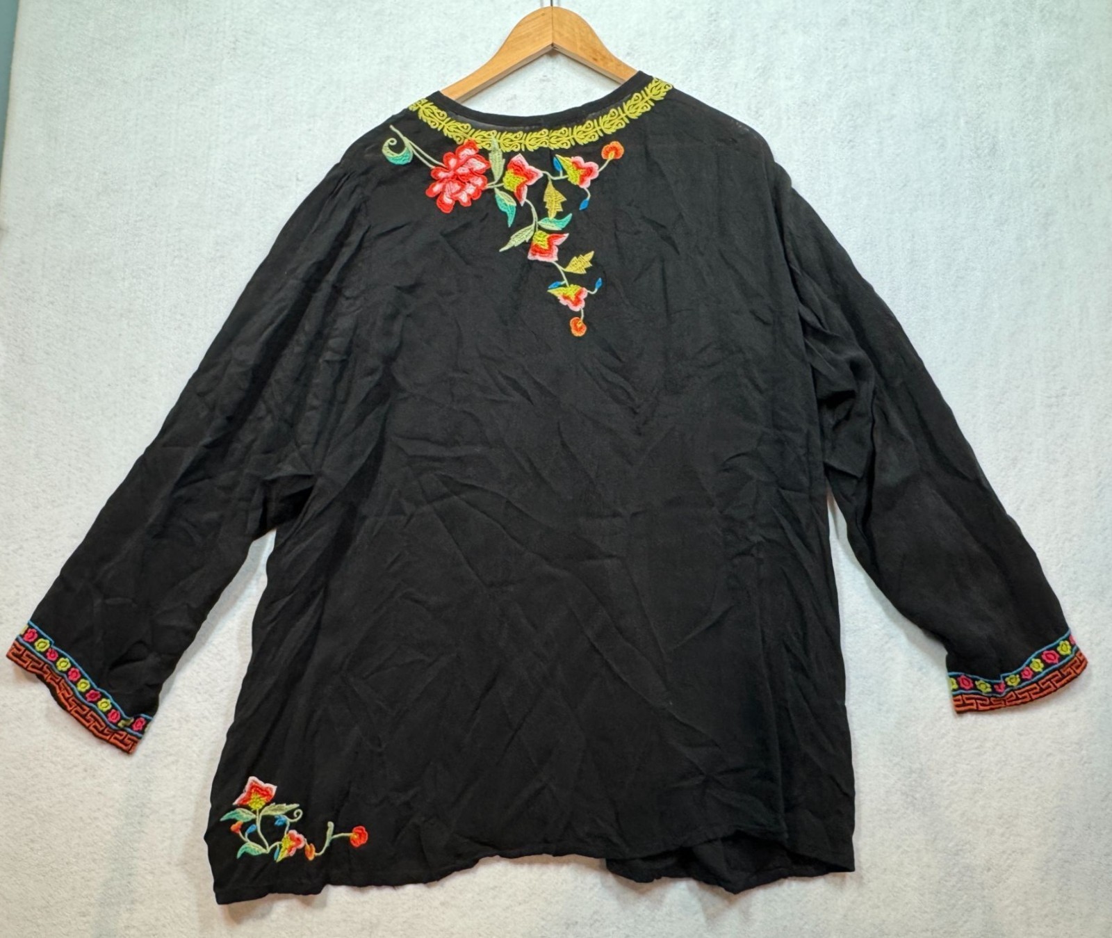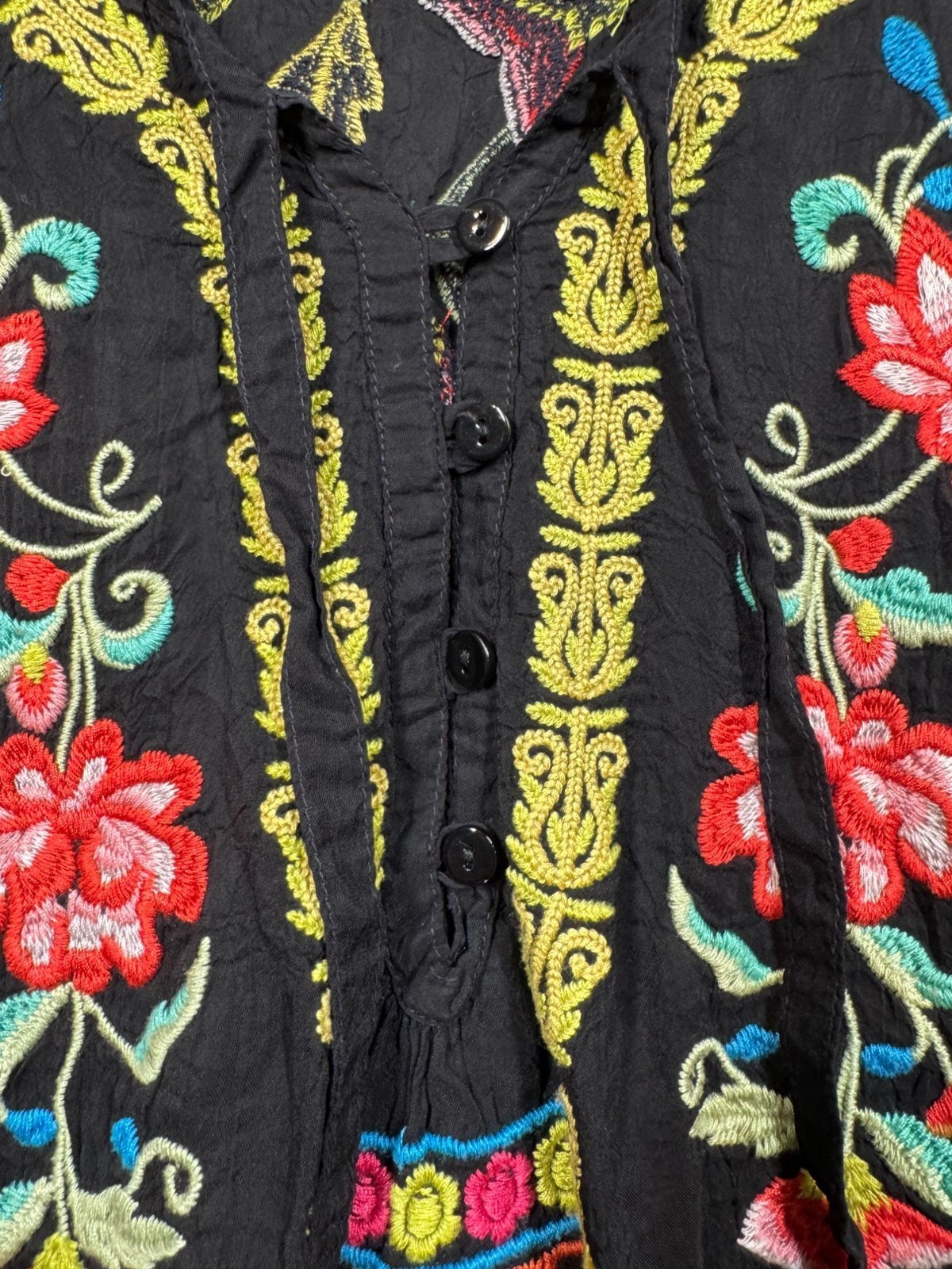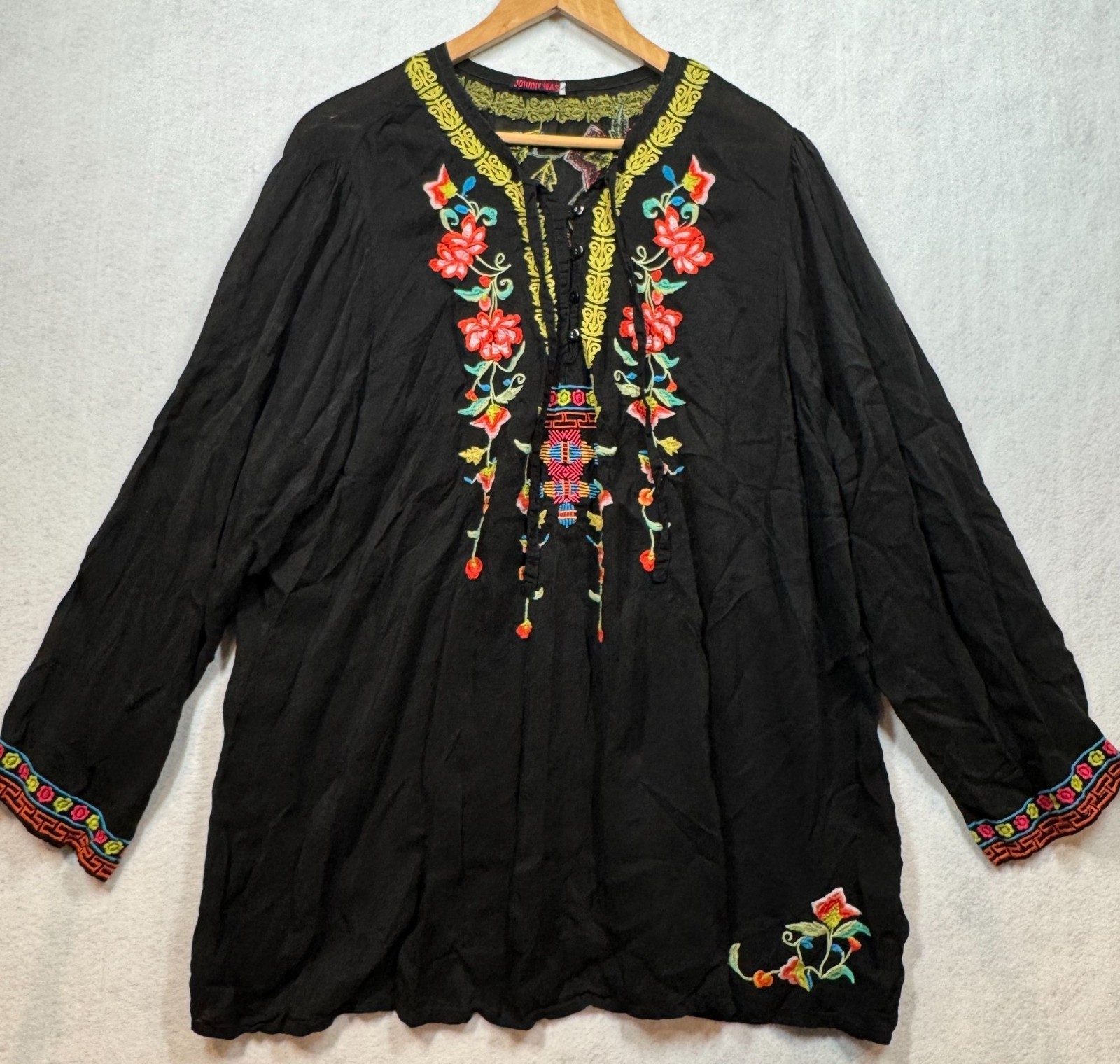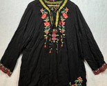 - Johnny Was Suko Tunic Top Black Embroidered Floral Tie Neck Boho Shirt Womens 3X