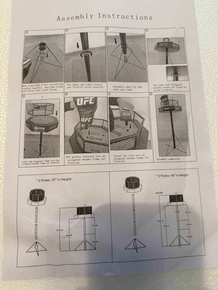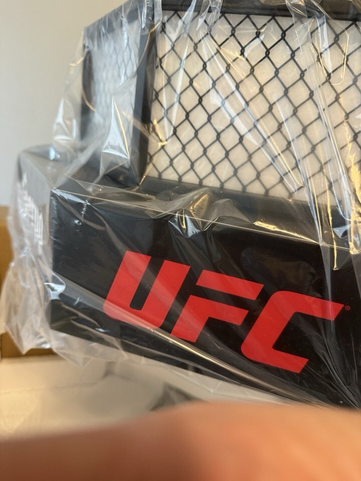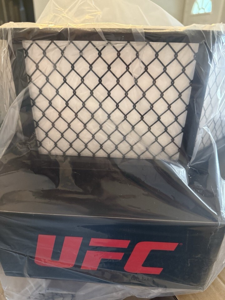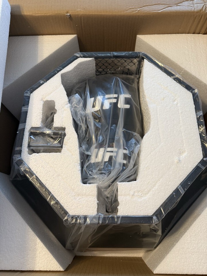 It has never been displayed. Found a picture of one put together so it can be seen. It has not been taken out of the box for any reason other than to take the pictures. The octagon is surrounded by plastic inserts with a cage painted on them. 2 of those have broken inside the box already so please see photos. The base of the cage is 22 inches wide and cage itself is 17. The stand is supposed to go to either 37 or 48 inches high. This is a pretty awesome UFC display piece.