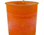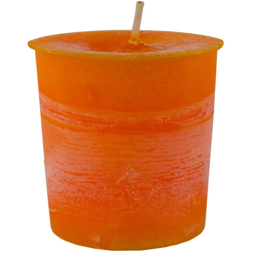 This orange, 2 inch tall joy herbal votive candle has been scented with the fragrance of plumeria, jasmine and sandalwood. Note that we buy these in bulk and the color can vary slightly from lot to lot. Made in the U.S. by Crystal Journey Candles.