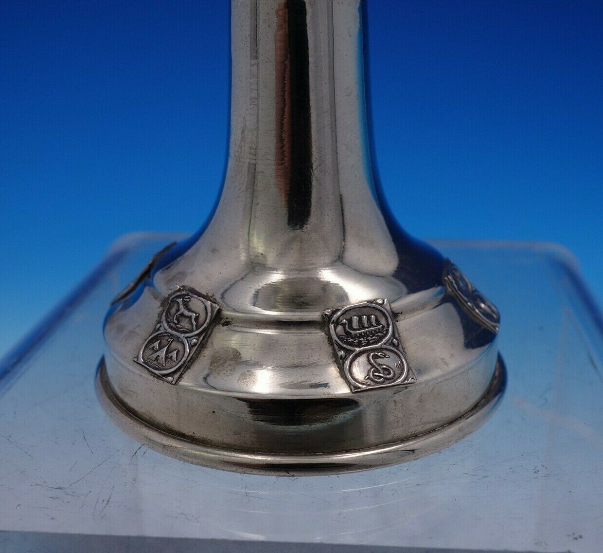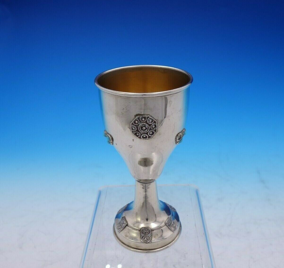 Beautiful Judaica sterling silver seder cup with applied turquoise stones and medallions and gold washed interior (maker unknown). This piece measures 4 7/8" tall x 2 1/4" and weighs 1.8 troy ounces. It is not monogrammed and is in good estate vintage condition. Note: Some stones are missing. Wonderful piece!