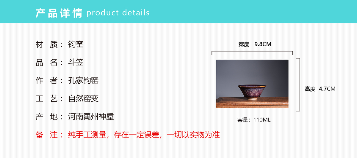 KONG FAMILY JUN KILN DOU LI HAT TEACUP – ONE-OF-A-KIND CHINESE INTANGIBLE CULTURAL HERITAGE TEAWARE Crafted by the renowned Kong Family (a legacy workshop of Jun Porcelain, China’s national intangible cultural heritage), this teacup is far more than a tea vessel—it’s a wearable art piece for your tea space. Its showstopping feature? The natural jun glaze kiln change: each cup blooms with unique iridescent purple-blue gradients (no two pieces are identical) – a signature of ancient Jun Kiln craftsmanship, coveted by collectors worldwide. The classic douli-hat shape (wide rim, tapered body) isn’t just aesthetic: it fits comfortably in hand, lets tea aromas unfold, and aligns perfectly with traditional Chinese tea ceremony etiquette. Made with lead-free, cadmium-free ceramic, it’s safe for daily tea tasting (matcha, oolong, pu-erh, etc.). Whether you’re a tea enthusiast, a cultural art lover, or hunting for a premium gift—this cup blends timeless heritage, functional charm, and exclusive kiln magic. Add a touch of Chinese royal kiln elegance to your tea rituals (or surprise a tea lover) today! Jun Ceramic Shipping Guarantee: We ship via China Post ePacket/EMS (100% trackable) to US/Europe/Australia. Delivery time: 10-25 business days (varies by region). All pieces are professionally packaged with bubble wrap + foam + double corrugated carton + corner protectors to avoid damage. Customs duties/taxes are the buyer’s responsibility. We provide a commercial invoice with accurate declaration for smooth clearance. If the product is damaged during shipping, please contact us within 3 days of receipt with photos/videos – we offer a full refund or free replacement (shipping cost not included).