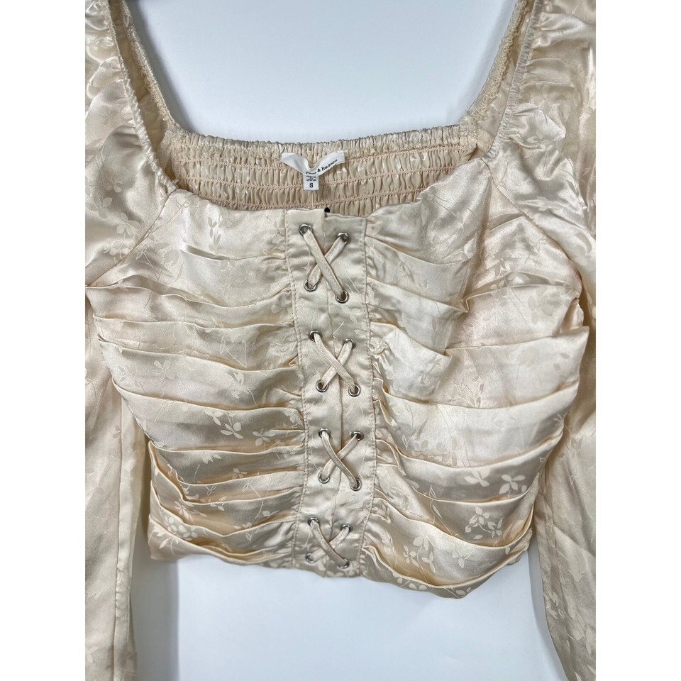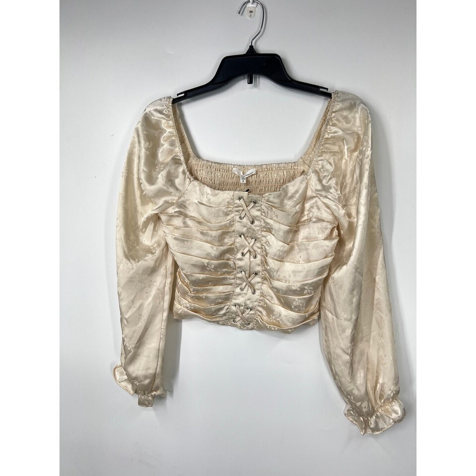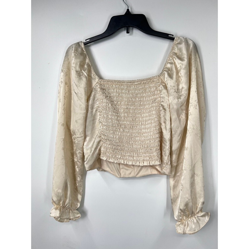 Keywords: June Hudson, floral top, crop top, lace up top, long sleeve blouse, square neck top, beige blouse, party top, going out top, romantic top, blouse, womens top, small, size S
