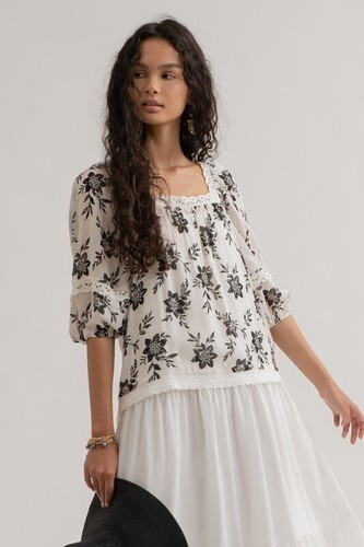 Champagne dreams come to life in this stunning June Hudson crop top. The romantic floral pattern shimmers subtly across the silky fabric, catching the light with every move. A flattering square neckline and long, voluminous sleeves with ruffled cuffs add a touch of vintage glamour, while the lace-up front creates a cinched silhouette. The smocked back ensures a comfortable and flexible fit. Perfect for a date night, a special occasion, or adding a touch of elegance to your everyday style.