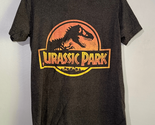 Brown Jurassic Park graphic t-shirt with orange and yellow logo.