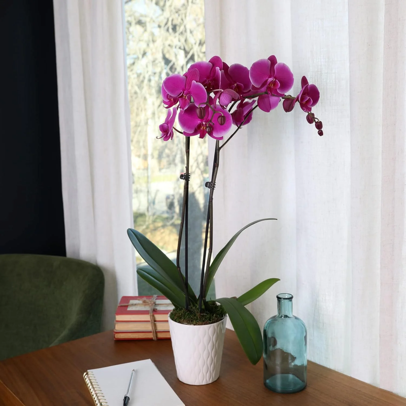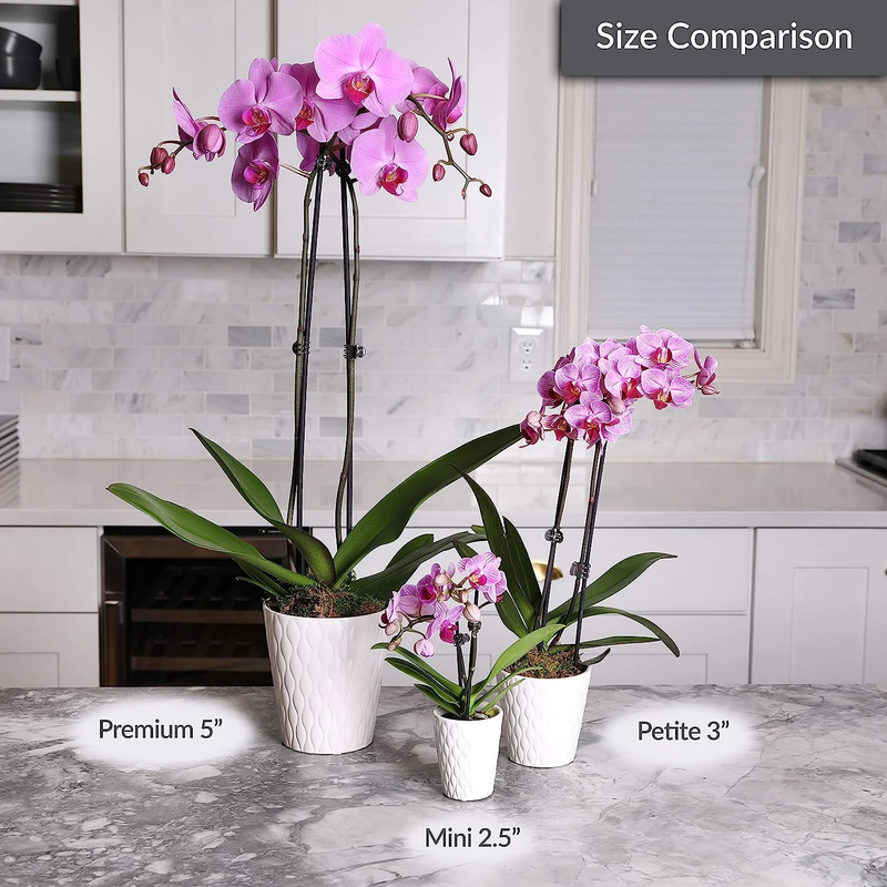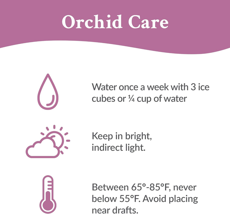 Add beauty to your home with the Just Add Ice 16-30" Purple Premium Orchid Live Plant in Moss Topped 5" White Ceramic Pot. A long-lasting, real orchid plant is a sophisticated and elegant choice for plant decorations.These purple orchid flowers make a beautiful addition to any space. Keep it in a room with bright, indirect sun. Live orchid plants for delivery are a great choice for birthdays, Valentine's Day, anniversaries, and all occasions. Orchids are an easy indoor plant! Water your live orchid plants with one ice cube weekly. Keep in a room with bright, indirect light. Our advanced packaging technology ensures your live indoor plants arrive beautiful and safely! They ship right from the greenhouse to your home, and go through a transition process to help them adapt to fluorescent lighting, ensuring they can thrive in any room of your home. Care Instructions: Water once a week with 3 ice cubes or OE cup of water. Keep in bright, indirect light. Temperatures in the room should remain between 65 degrees F to 85 degrees F, never below 55 degrees F. Avoid placing near drafts.