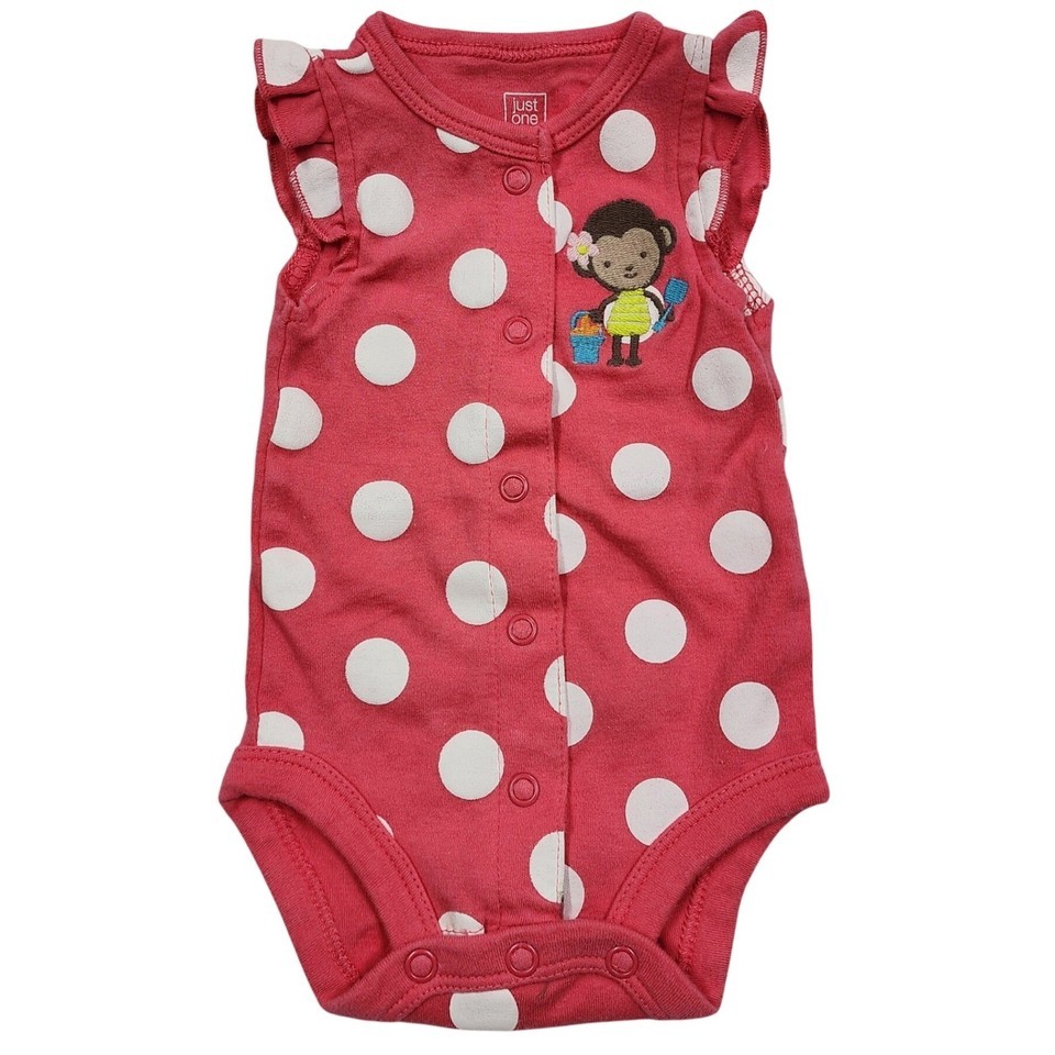 Keywords: baby girl bodysuit, newborn bodysuit, sleeveless bodysuit, polka dot, monkey applique, infant clothing, baby clothes, one piece, just one you, carters, pink bodysuit, white polka dots, summer bodysuit, newborn gift