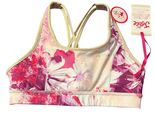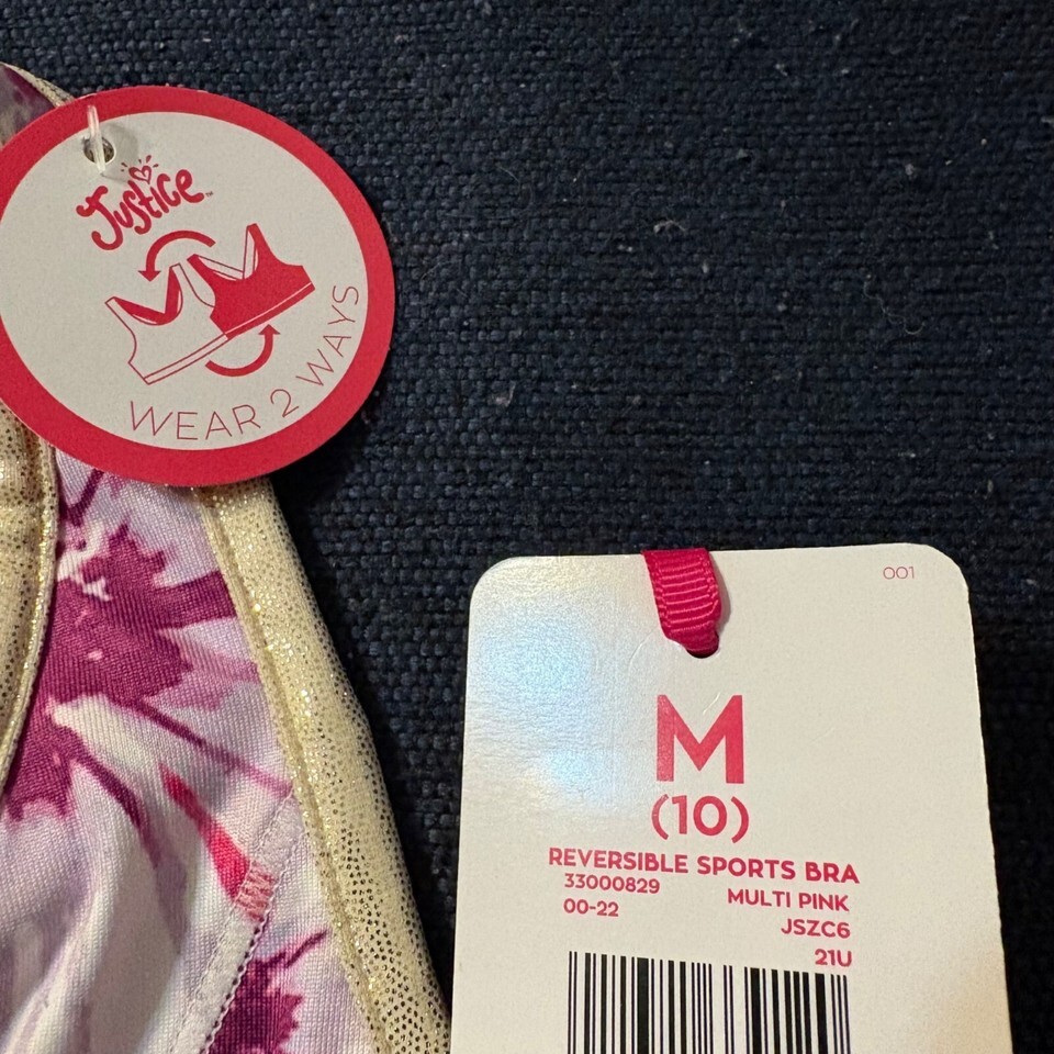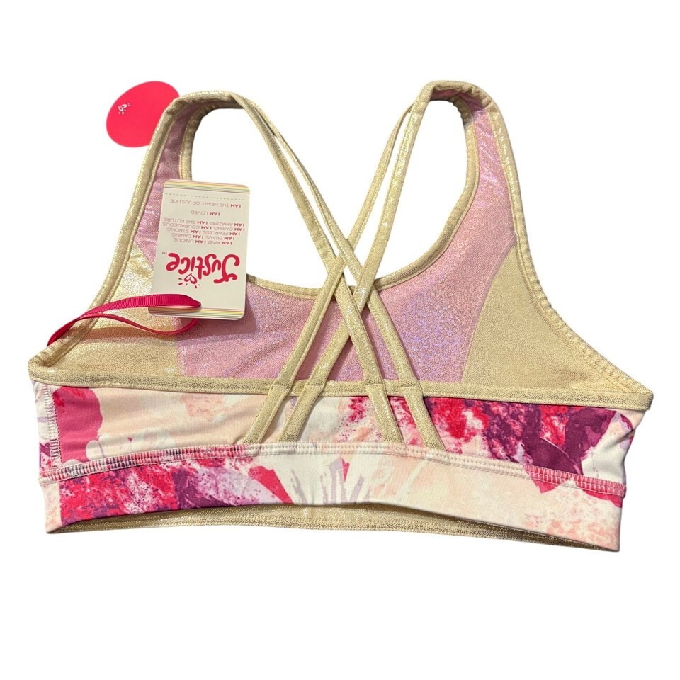 This reversible sports bra features a vibrant floral design on one side and glitter accents on the other, offering style and versatility.