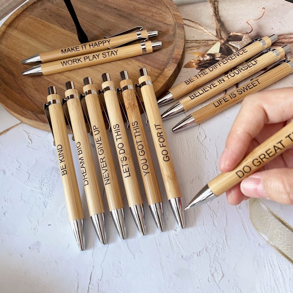 Enough QuantityYou'll get 12 pieces of bamboo wooden ballpoint pens in 12 styles (motivational quotes that will brighten up your day ) , plenty to meet your daily needs or to give as gifts to family and friends.The size of a single pen is 5.4 x 0.4 inch/ 13.8 x 1 cm,which is the proper size for a pen; Note: The ink on the refill is black